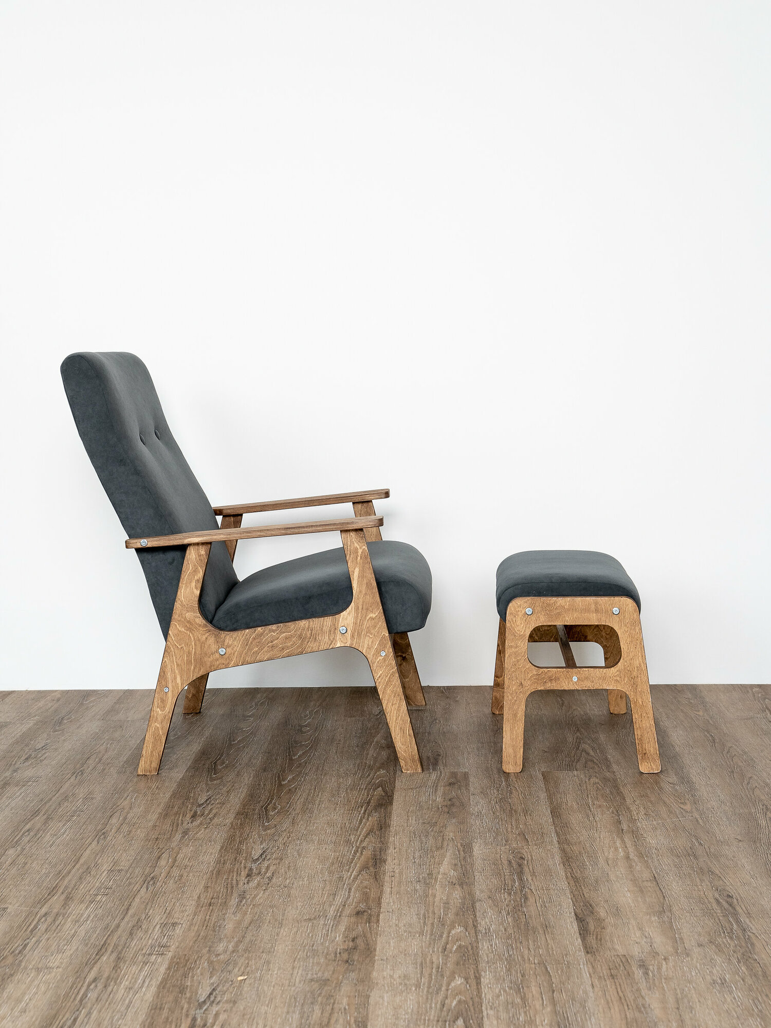 Комплект Чилл ZASIDELIS кресло с пуфом для ног, велюр, темно-серый, ноги коричневое масло