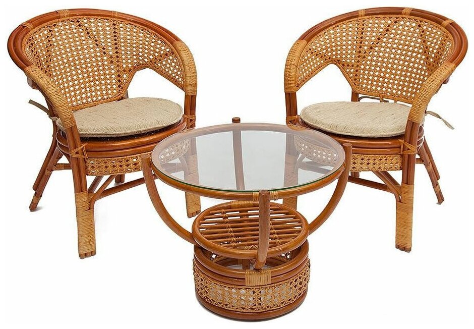 Комплект плетеной мебели из ротанга Tetchair "PELANGI" 02/15 ( стол со стеклом + 4 кресла ) [с подушками] ротанг, кресло 65х65х77см, стол диаметр 64х61см, walnut (грецкий орех)