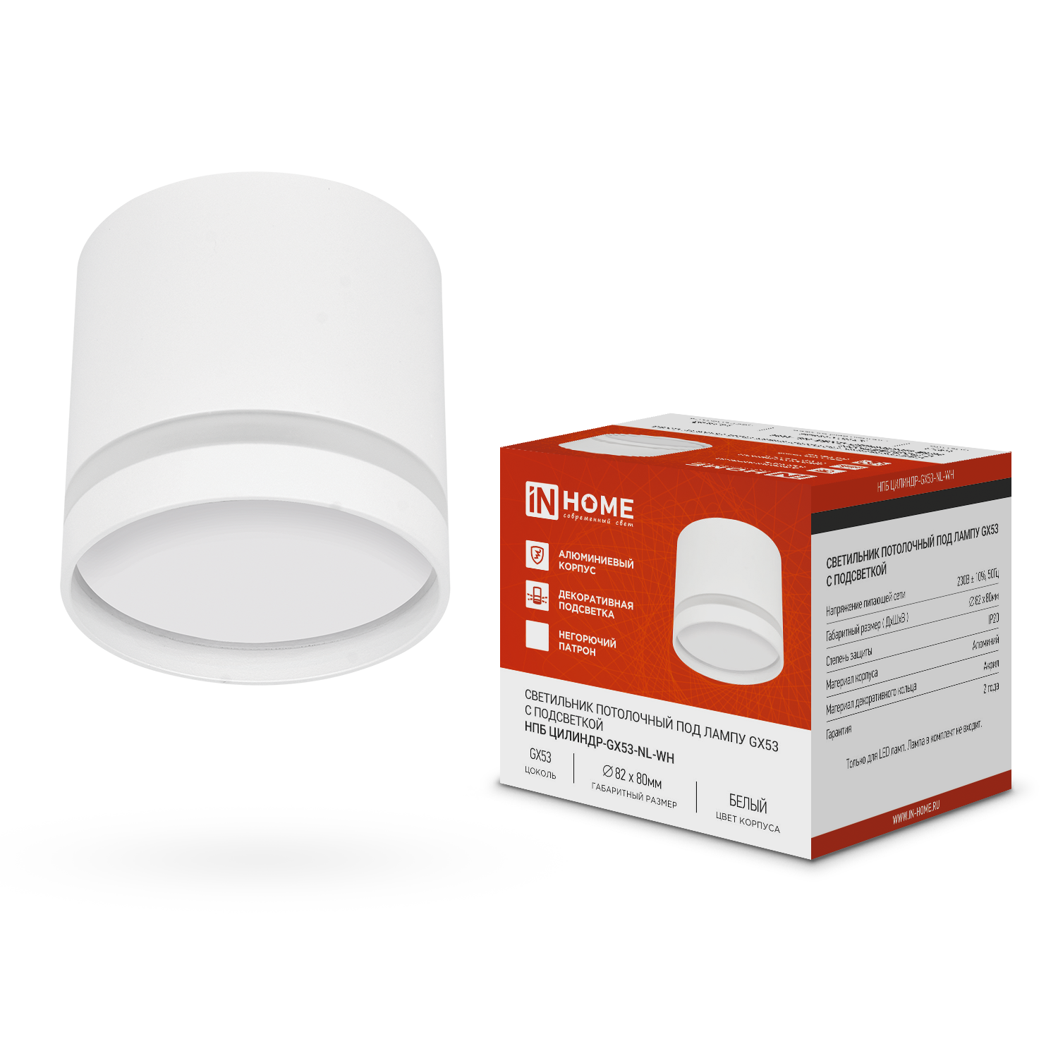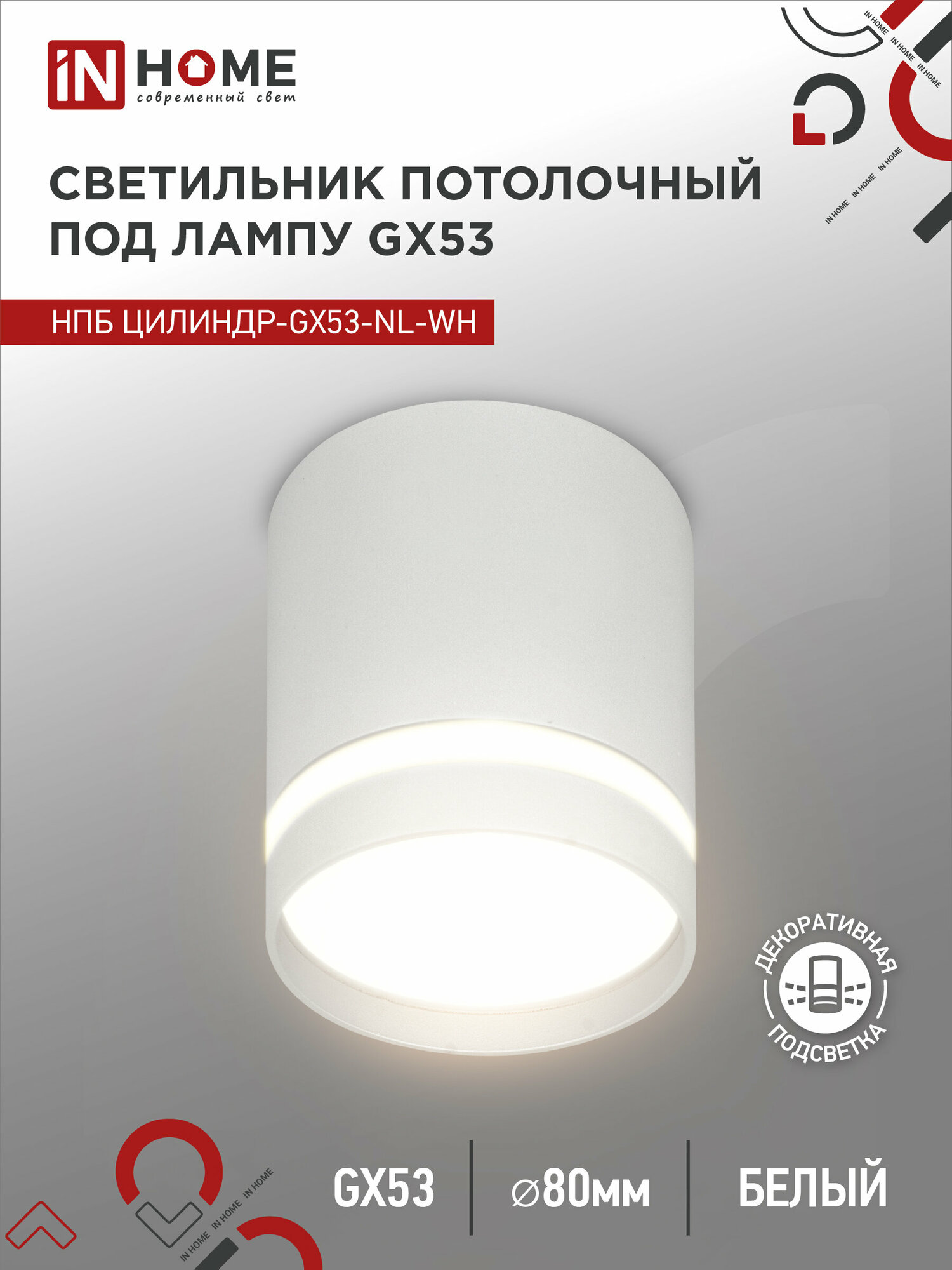 inHome светильник светодиодн. накладной спот НПБ ЦИЛИНДР-GX53-NL-WH алюм/белый 82x80 под лампу GX53 6532 (арт. 868027) интересное: