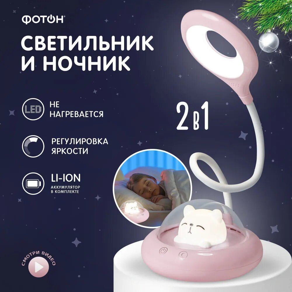 СохранитьЛампа настольная, светильник ночник детский аккумуляторный фотон Космический кот, розовый интересное: