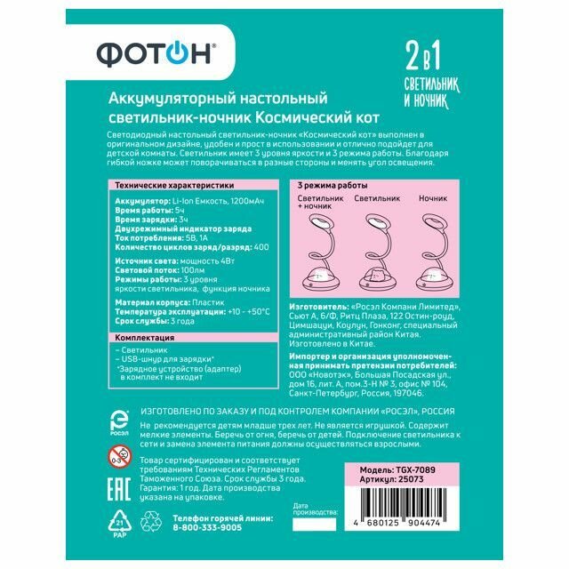 | Комплектация | Светильник светодиодный Фотон Космический кот голубой |
