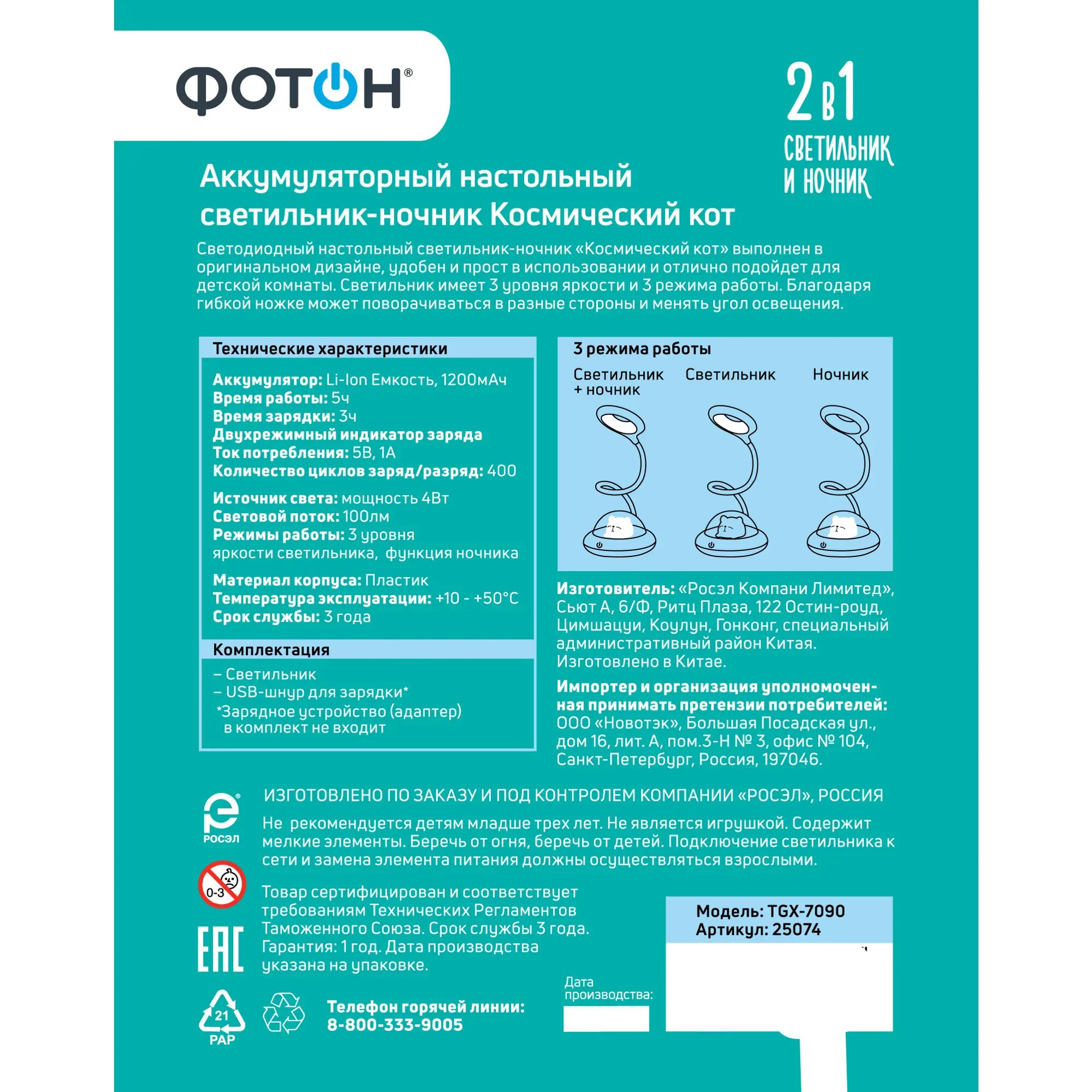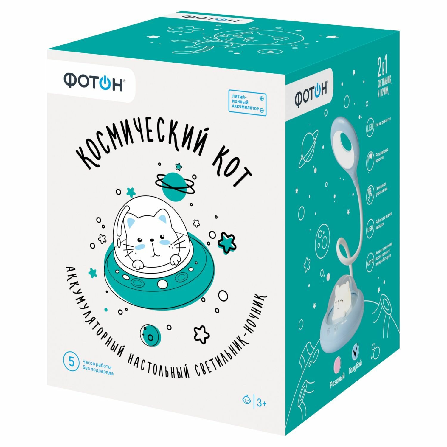 | Комплектация | Светильник светодиодный Фотон Космический кот голубой |