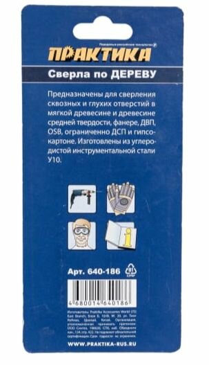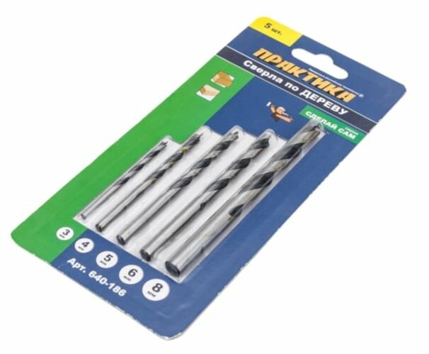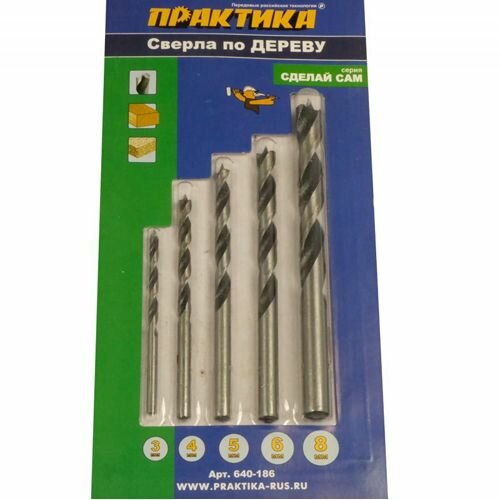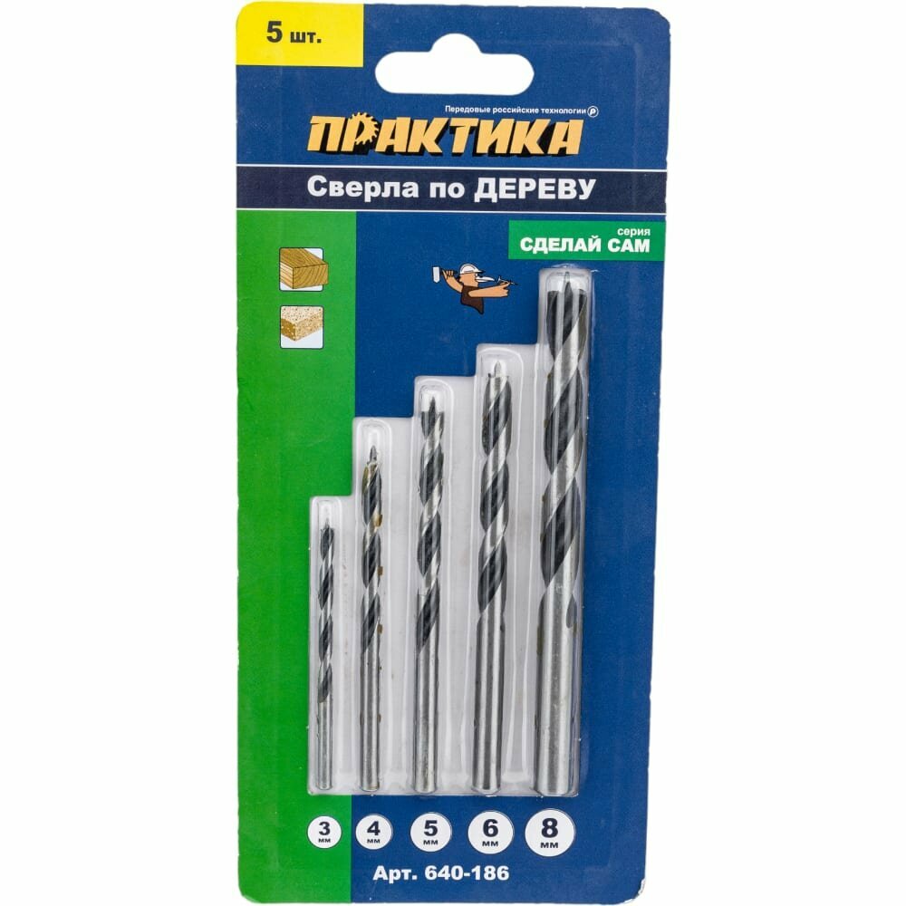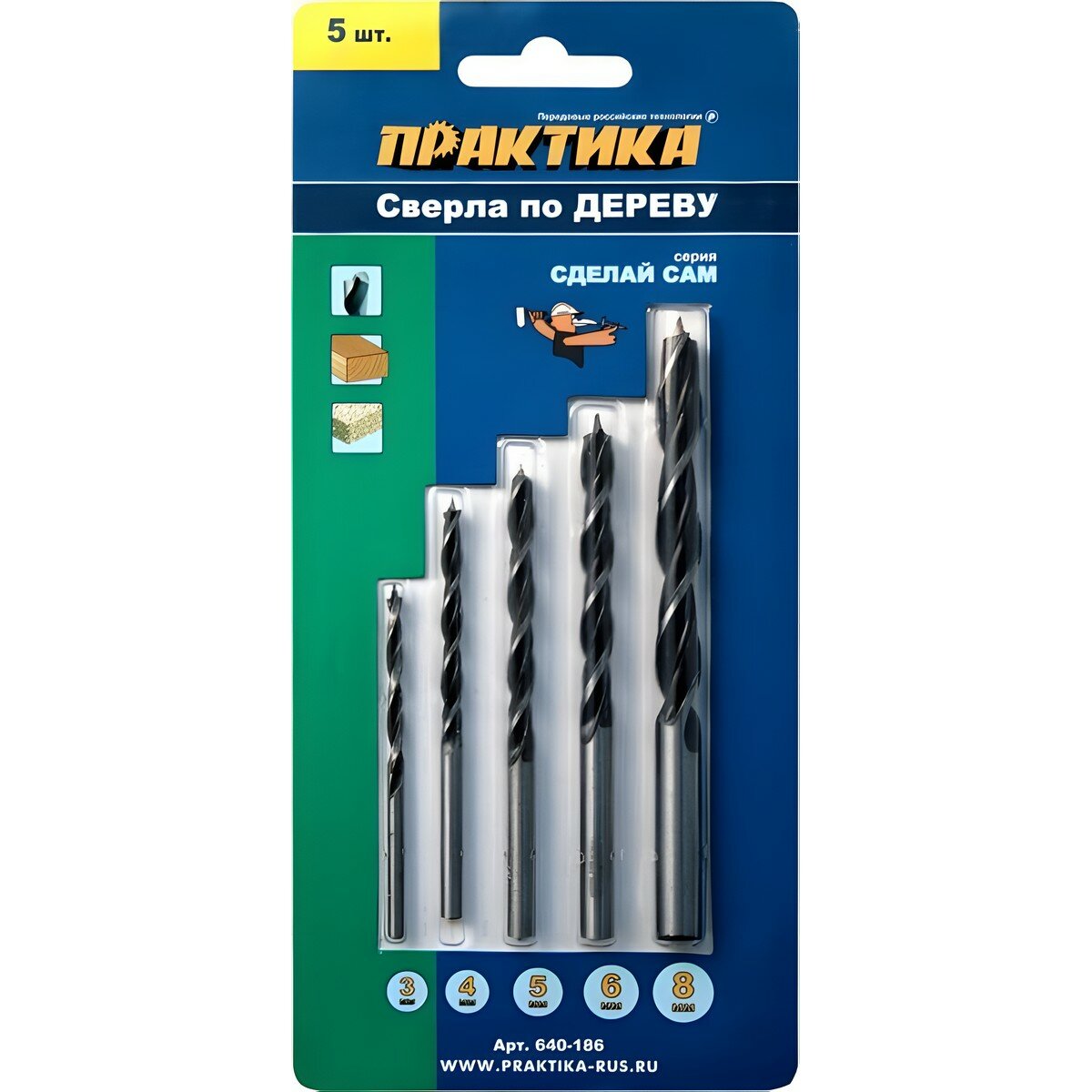 Набор сверл по дереву ПРАКТИКА "Сделай сам", 5 шт, 3,4,5,6,8 мм, блистер (640-186)