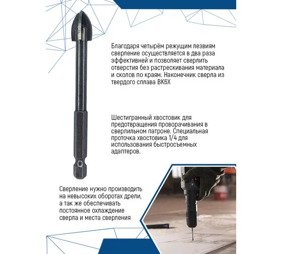 Сверло по стеклу и керамике VertexTools 6 мм четырехгранное сверло с шестигранным хвостовиком твердосплавное ВК6Х