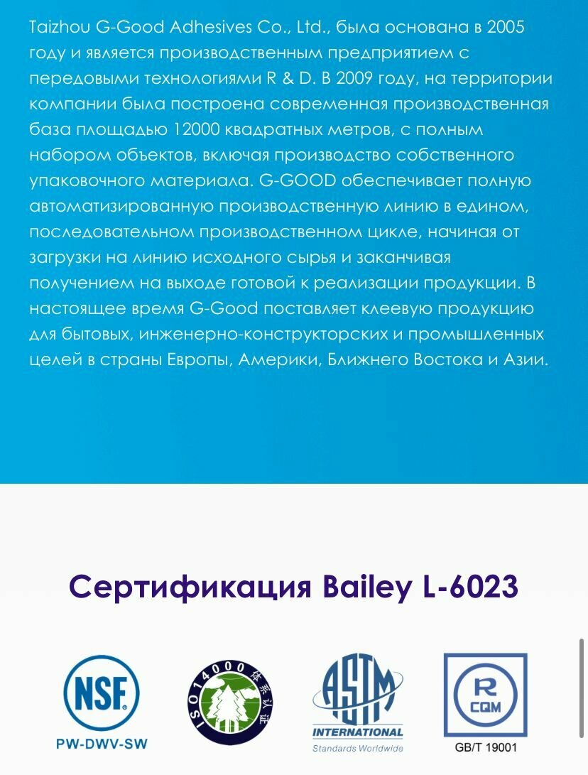 | Свойства | водостойкий / моментальный / морозостойкий / прозрачный / термостойкий |