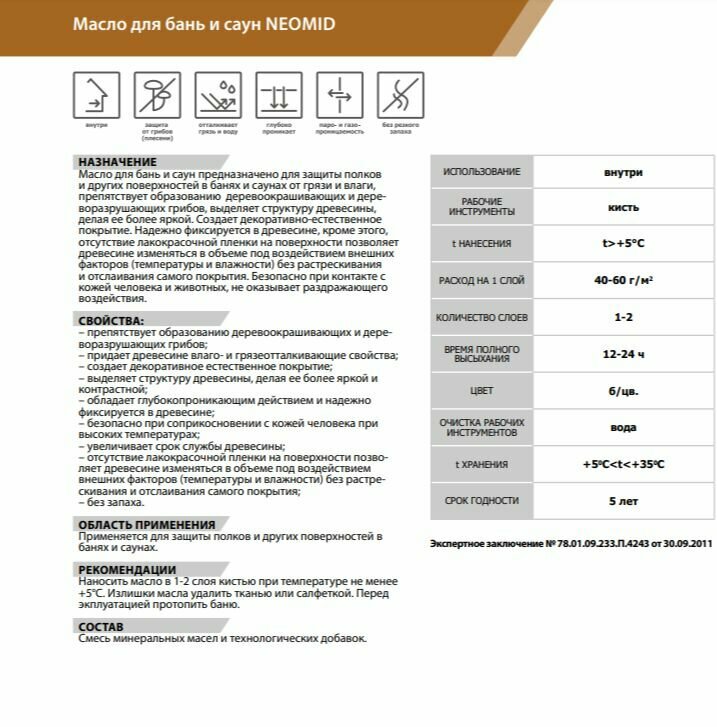 | Дополнительная информация | Масло для бань и саун Neomid цвет прозрачный 0.25 л |