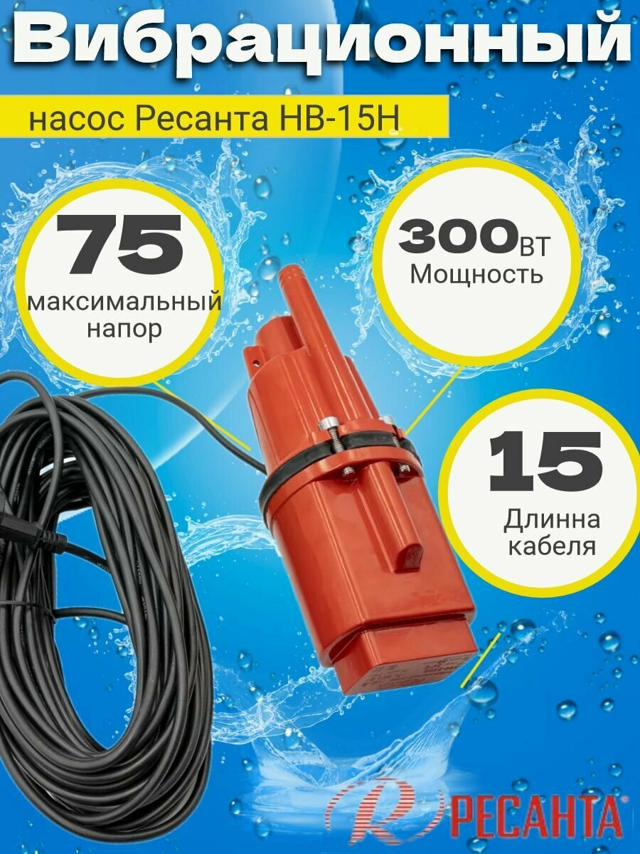 Насос погружной садовый НВ-15Н РЕСАНТА вибрационный с нижним забором воды (кабель 15м, с термозащитой, 300 Вт, 22 л/мин, диаметр насоса - 100 мм) для полива / для дома и дачи