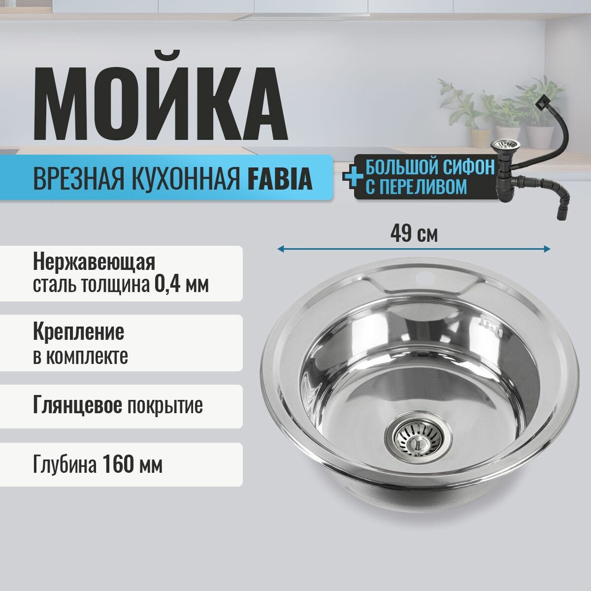 Купить fabia 4904 мойка врезная круглая, d = 49 см, из нержавеющей стали, толщина 0,4 мм, глубина 160 мм, без крепежей, с сифоном мойка врезная