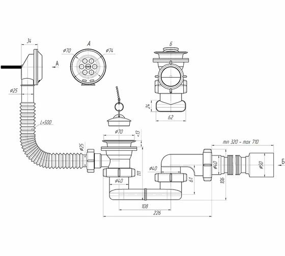 | Дополнительная информация | тип сифона: плоский; решетка слива: Ø70мм при выпуске 1½; высота гидрозатвора: 50 мм; пропускная способность: 24 л/мин; комплектуется гибкой трубкой 40*50 мм для отвода в канализацию; наличие перелива: да |