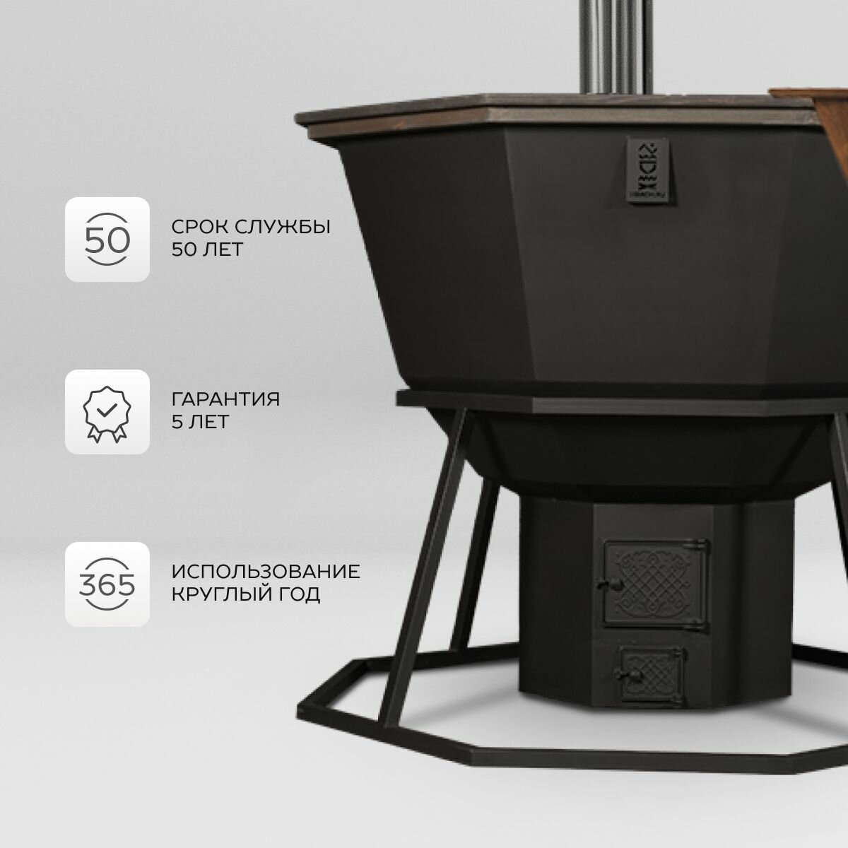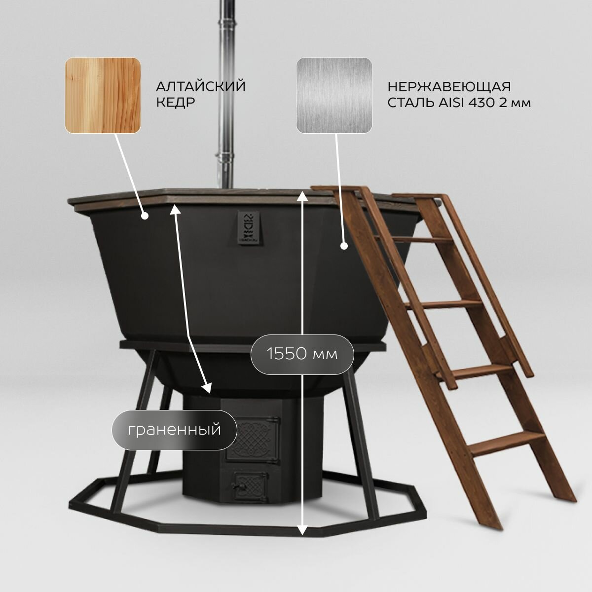 | Подробная комплектация | Чаша из нержавеющей стали AISI 430 толщиной 2 мм - 1 шт., Лестница из алтайского дерева - 1 шт., Опора из черного металла- 1 шт., Печь из черного металла - 1 шт., Дымоход - 1 шт. |
