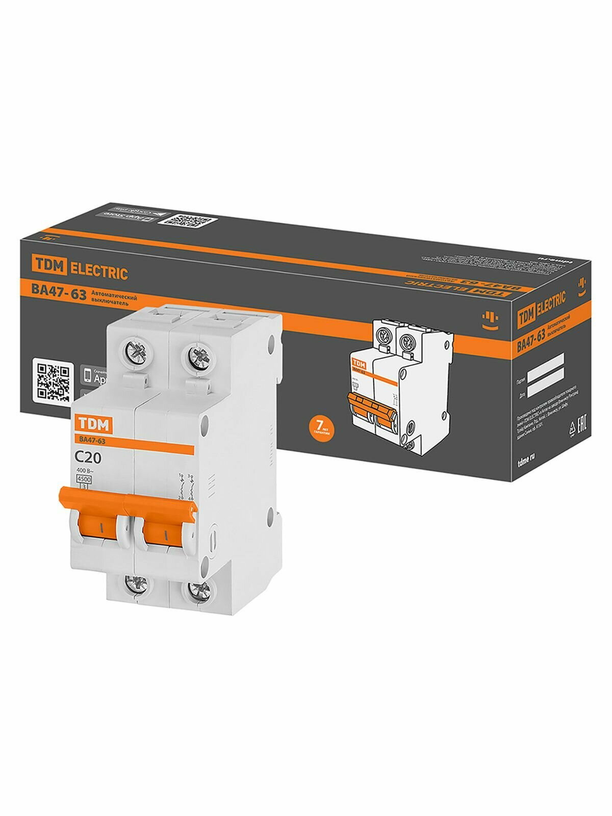 Автоматический выключатель TDM Electric ВА47-63 2P C20 А 4.5 кА SQ0218-0027