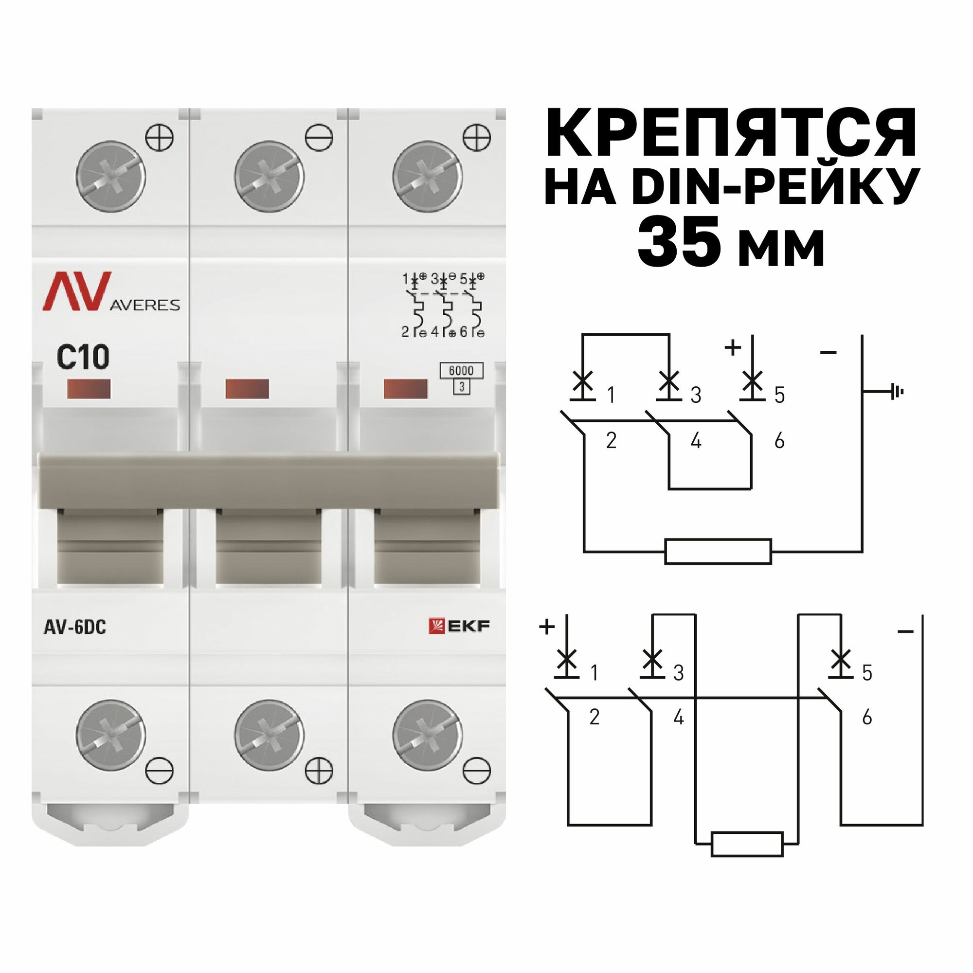 СохранитьАвтомат постоянного тока 10А, тип C, трехполюсный 3P, 6kA, EKF AVERES AV-6 DC (Выключатель автоматический C10 (DC)) интересное: