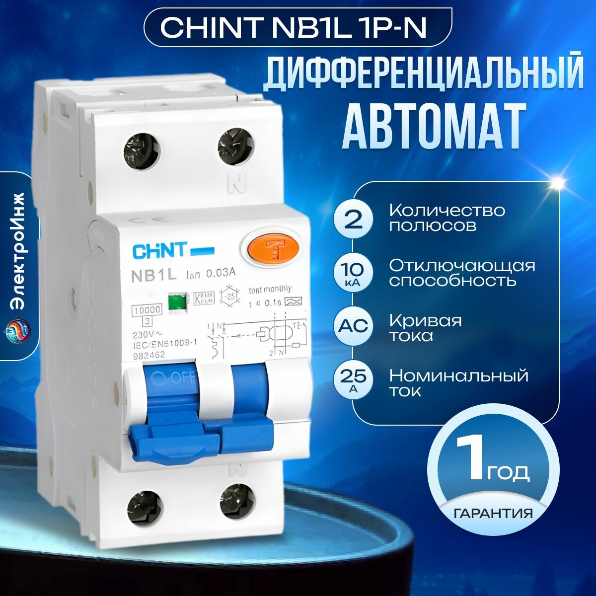 Дифференциальный автоматический выключатель Chint, Nb1l, 1P+N, C25, 30mA, тип AC, 10kA, 36mm 203109 .