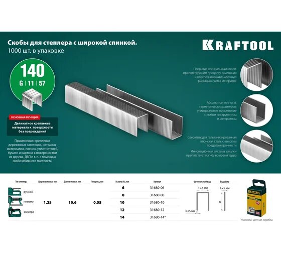 Ниже Вы можете прочитать отзывы на KRAFTOOL 8 мм скобы для степлера широкие тип 140, 1000 шт, ознакомится с подробными характеристиками, посмотреть интересные обзоры и фотографии на KRAFTOOL 8 мм скобы для степлера широкие тип 140, 1000 шт.