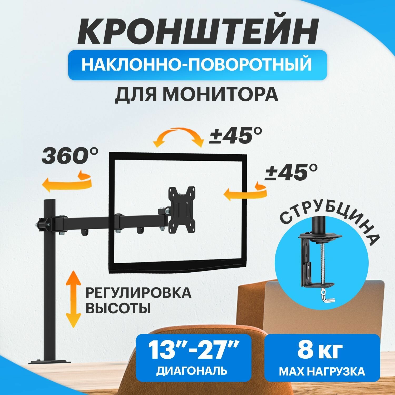 Кронштейн для монитора REXANT 38-0306 13"-27", одно колено настольный интересное: