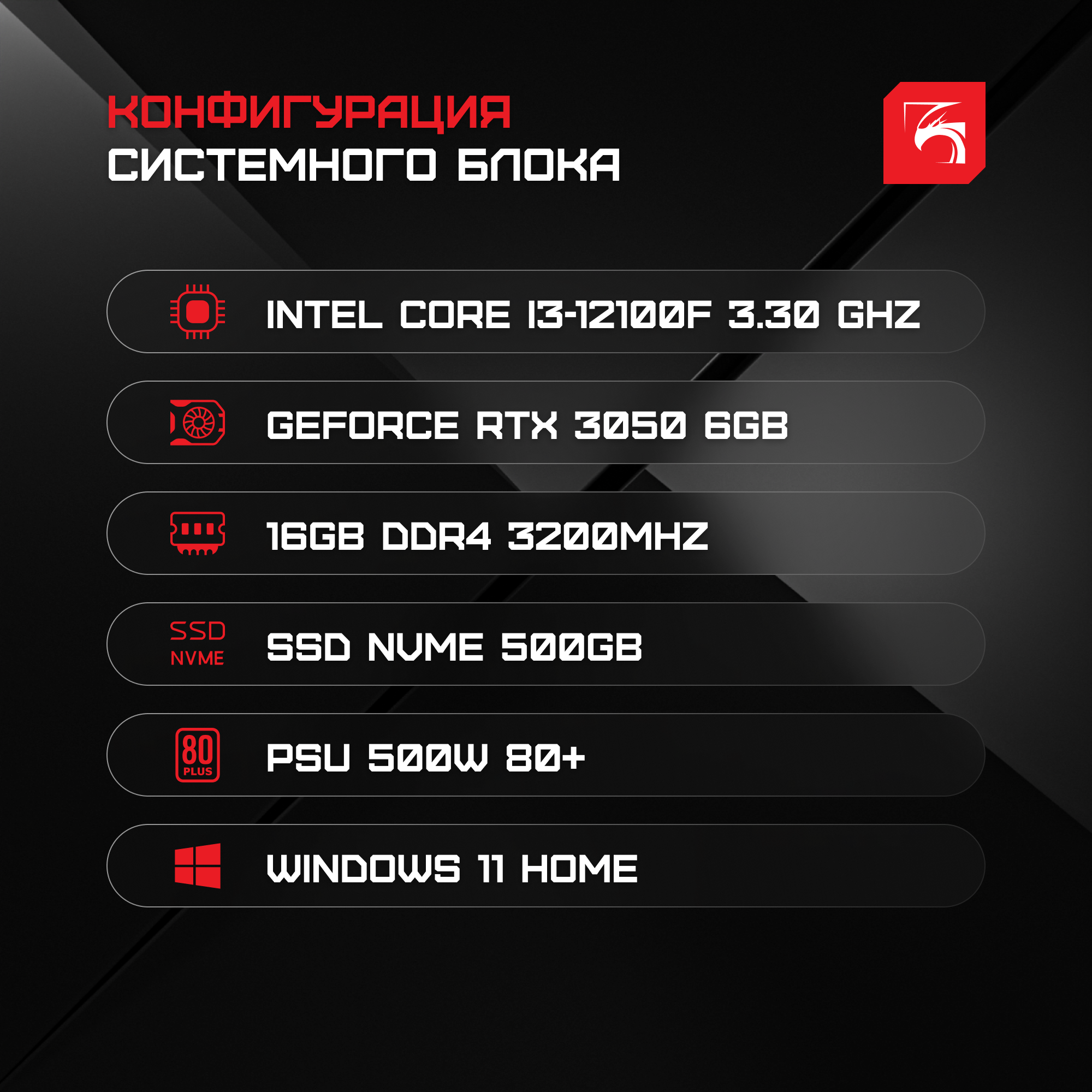 Игровой компьютер DigitalRazor i3-12100F+RTX3050+16GB DDR4+500GB SSD
