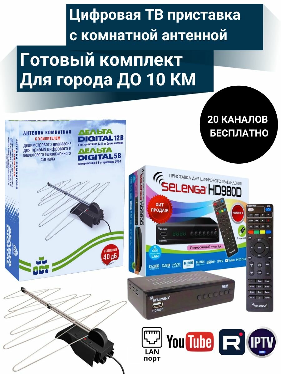Цифровая ТВ приставка HD 980D DVB-T2 с уличной активной антенной 35 дБ до 80 км (Кабельная сборка 10м)