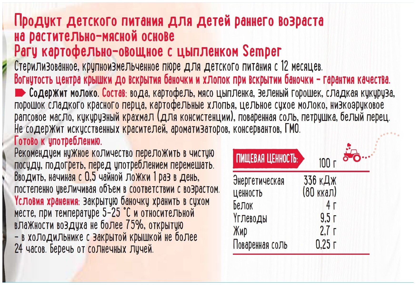 | Состав | картофель / мясо цыпленка / зеленый горошек / сладкая кукуруза / красный перец / картофельные хлопья / сухое молоко / рапсовое масло / кукурузный крахмал / поваренная соль / петрушка / белый перец вода |