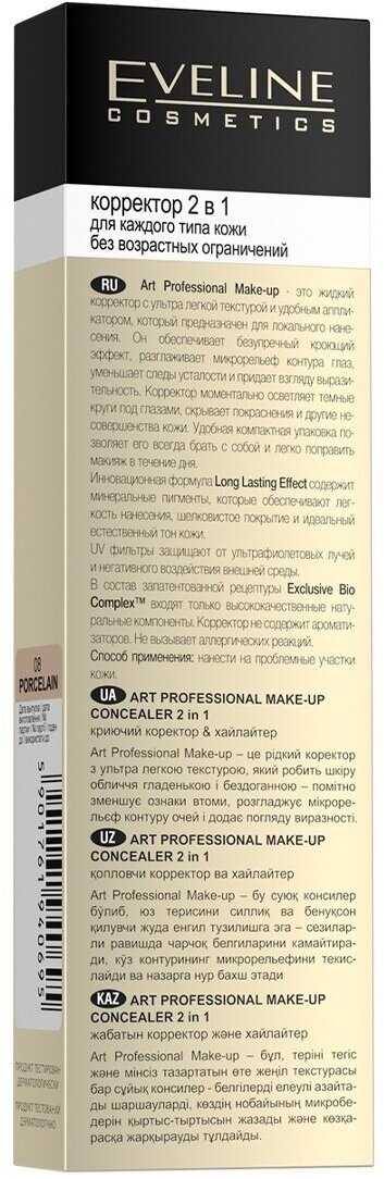 Купить EVELINE Корректор для лица ART PROFESSIONAL MAKE-UP тон 08 PORCELAIN 2 в 1 светоотражающий с кисточкой