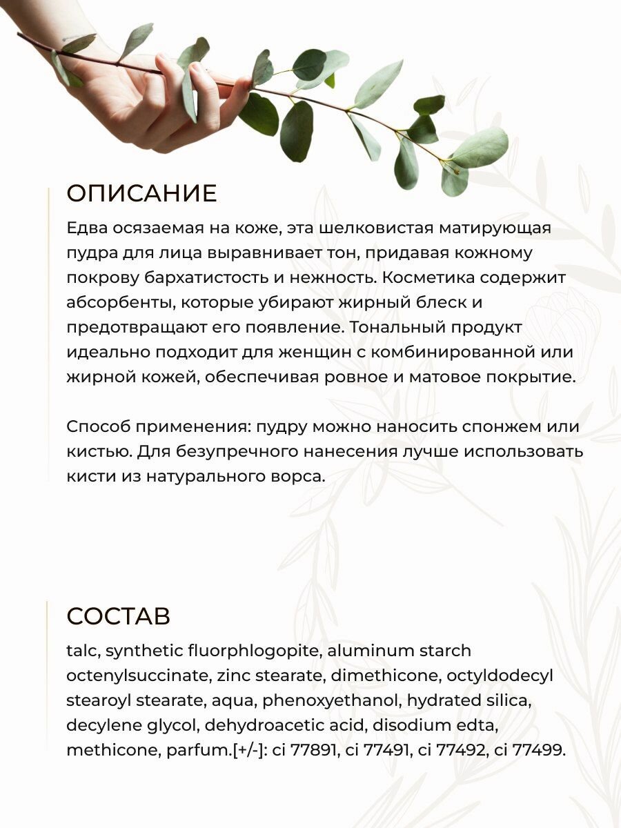 | Способ применения | Нанесите необходимое количество пудры на лицо при помощи спонжа или кисти.Средство может использоваться в качестве завершающего этапа при нанесении макияжа или точечно для уменьшения несовершенств кожи. |