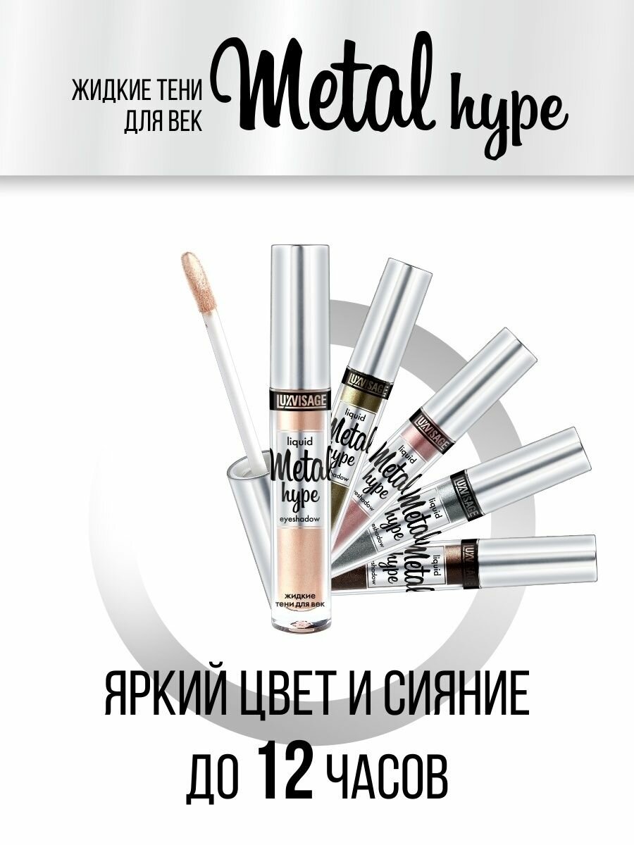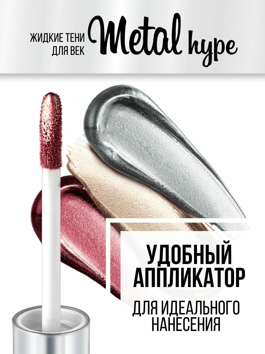 | Дополнительная информация | Жидкие тени для век Metal hype стойкие с металлическим сиянием. Насыщенные цвета с высоким содержанием перламутровых пигментов создают плотное мерцающее покрытие с первого слоя. Тени быстро высыхают, равномерно наслаиваются и растушевываются, сохраняют яркость цвета и сияние до 12 часов. Не требуют базы под тени. Содержат увлажняющие и смягчающие компоненты. |