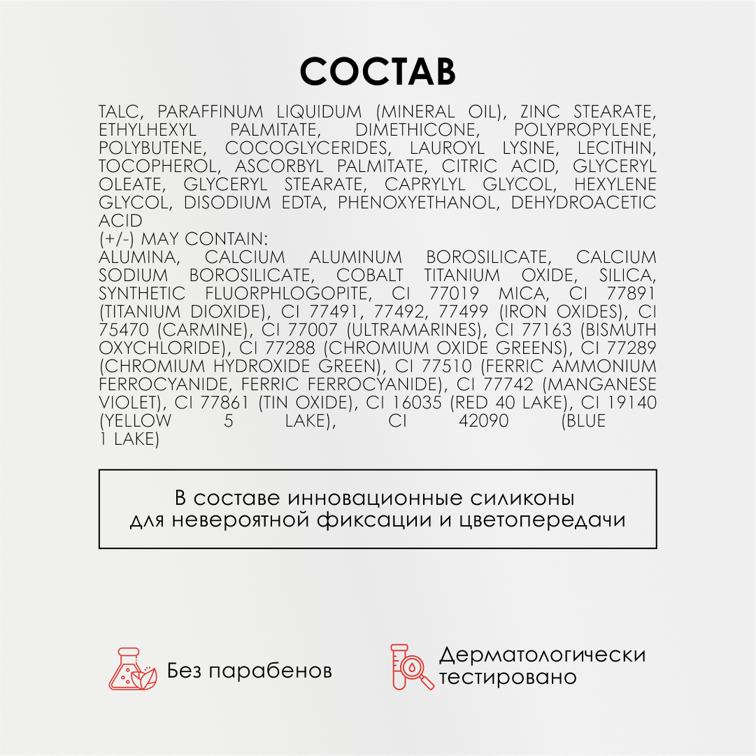 | Состав | talc, paraffinum liquidum (mineral oil), zinc stearate, ethylhexyl palmitate, dimethicone, polypropylene, polybutene, cocoglycerides, lauroyl lysine, lecithin, tocopherol, ascorbyl palmitate, citric acid, glyceryl oleate, glyceryl stearate, caprylyl glycol, hexylene glycol, disodium edta, phenoxyethanol, dehydroacetic acid |