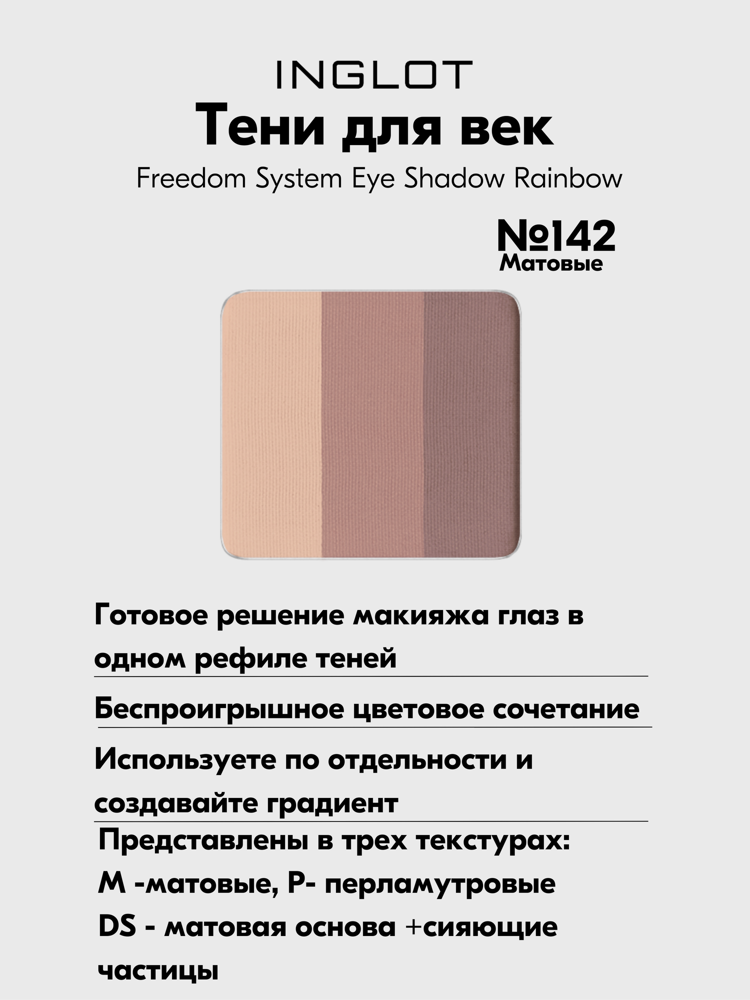 СохранитьТени INGLOT матовые для макияжа глаз 3 в 1 Freedom System Eye Shadow Rainbow MATTE №142 интересное: