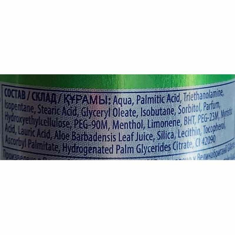 | Состав | Aqua, Palmitic Acid, Triethanolamine, Isopentane, Stearic Acid, Glyceryl Oleate, Isobutane, Sorbitol, Parfum, Hydroxyethylcellulose, PEG-90M, Menthol, Limonene, BHT, PEG-23M, Myristic Acid, Lauric Acid, Aloe Barbadensis Leaf Juice, Silica, Lecithin, Tocopherol, Ascorbyl Palmitate, Hydrogenated Palm Glycerides Citrate, CI 42090 |