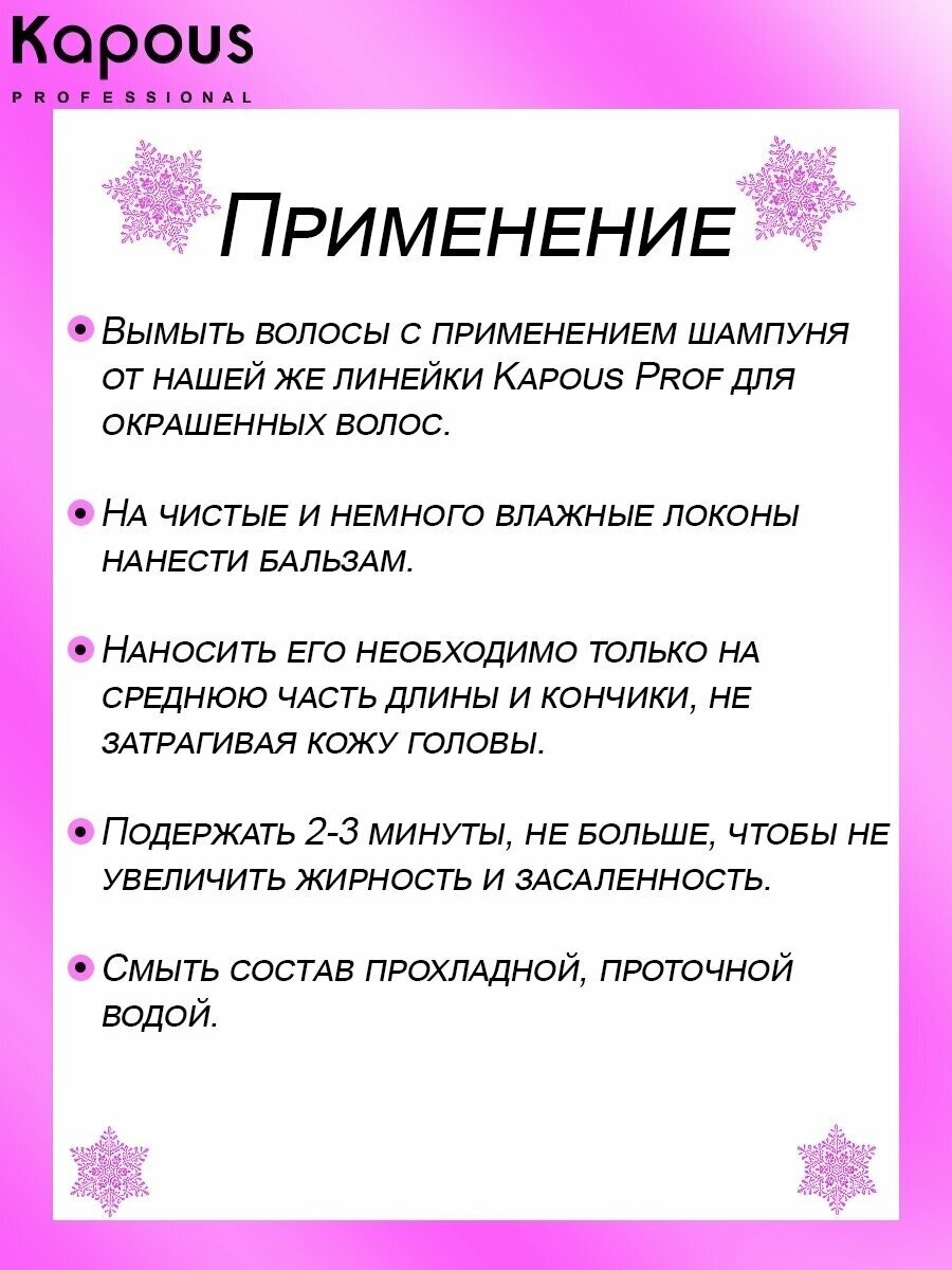 | Способ применения | После применения шампуня для окрашенных волос «Kapous Professional», небольшое количество бальзама равномерно распределить по всей длине волос, мягко массируя 3-5 минут, затем смыть теплой водой. |