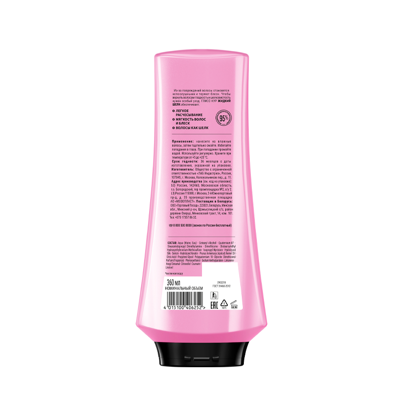 | Состав | aqua, cetearyl alcohol, quaternium-87, stearamidopropyl dimethylamine, dimethicone, distearoylethyl hydroxyethylmoium methosulfate, isopropyl myristate, hydrolyzed silk, sericin, prunus armeniaca kernel oil, tocopheryl acetate, panthenol, hydrolyzed keratin, citric acid, propylene glycol, phenoxyethanol, sodium methylparaben, parfum, glycerin, dimethiconol, polyquaternium-37, dicaprylyl carbonate, limonene, hexyl cinnamal, citronellol, coumarin |