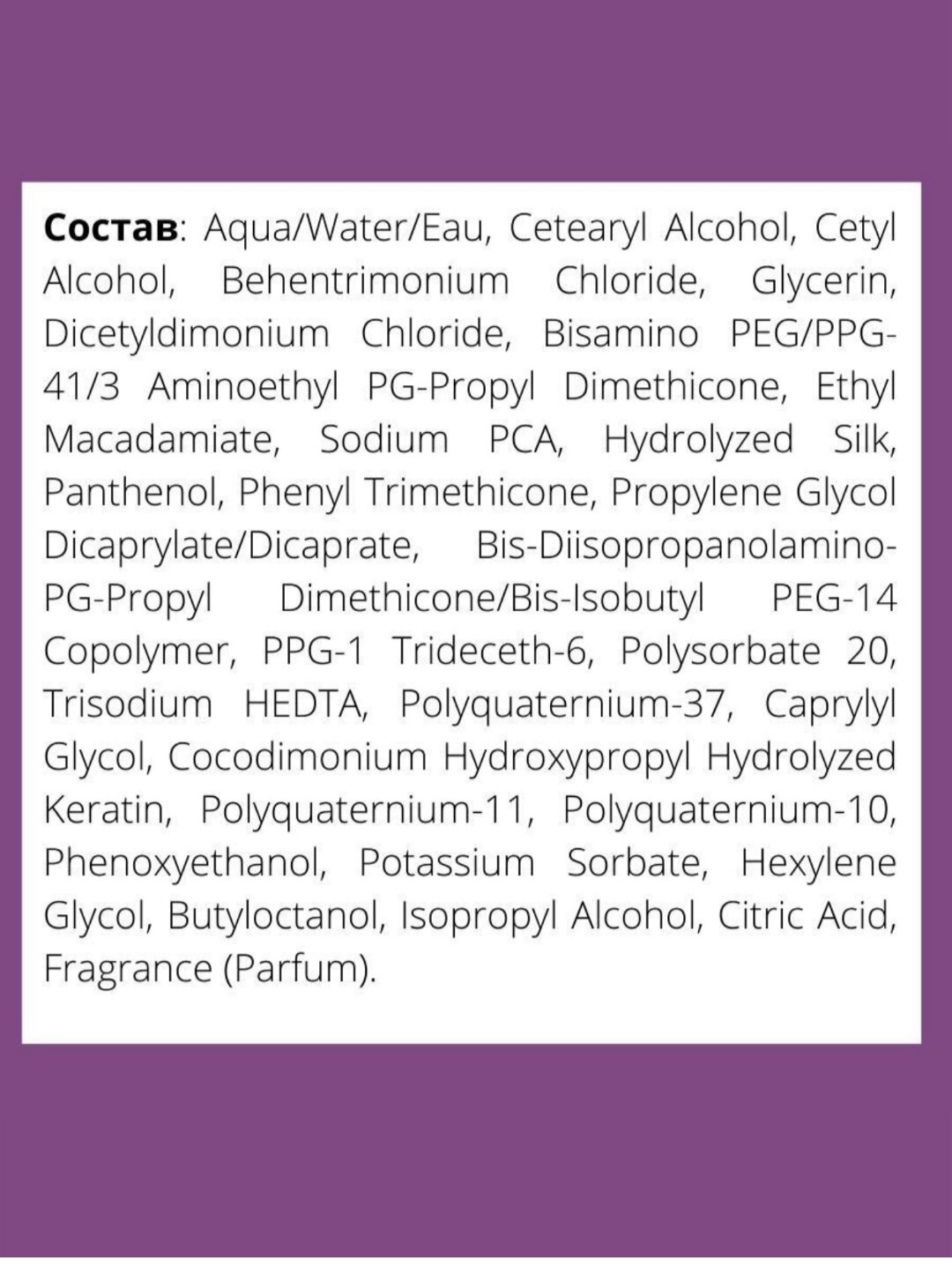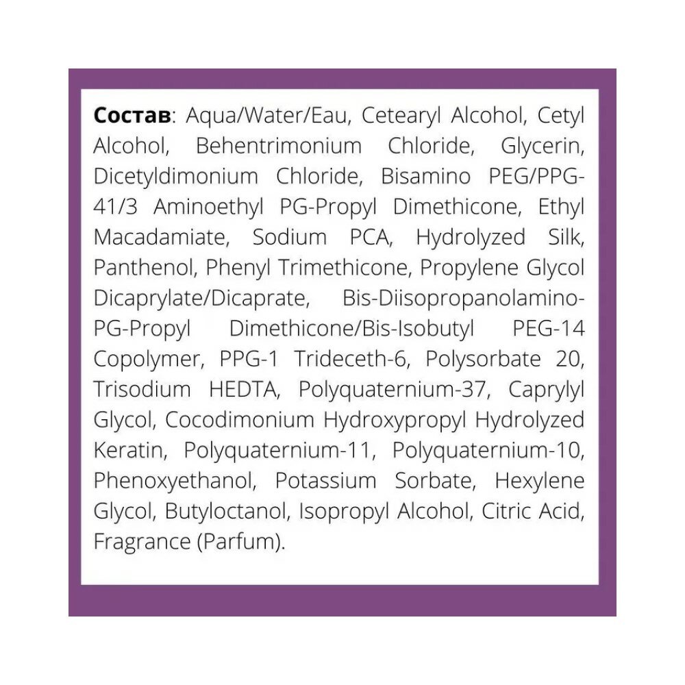 | Состав | вода/туалетная вода, цетеариловый спирт, цетиловый спирт, бехентримония хлорид, глицерин, дицетилдимония хлорид, бисамино пэг/ppg-41/3 аминоэтил пг-пропилдиметикон, этиловый макадамиат, пг-гидроксиэтилцеллюлоза, кокодимония хлорид, pca натрия, поликватерниум-37, ароматизатор (парфюмерия), поликватерниум-87, поликватерниум-11, гидролизованный шелк, фенилтриметикон, феноксиэтанол, каприлилгликоль, гексиленгликоль, сорбат калия, поликватерниум-10, пантенол, лимонная кислота, дикаприлат/дикапрат пропиленгликоля, ppg-1 тридецет-6 |