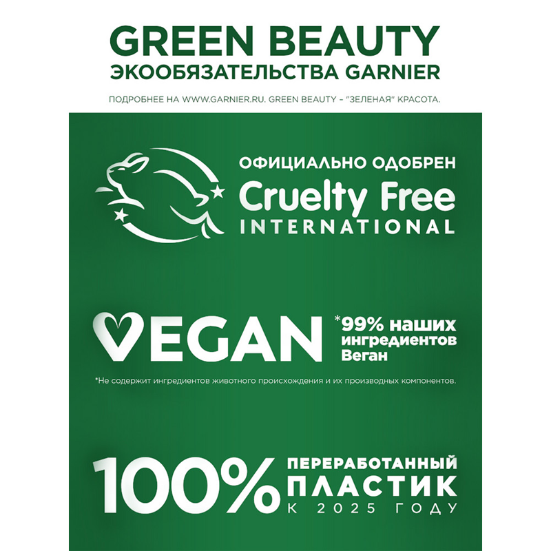 | Не содержит | ГМО / искусственных красителей / минеральных масел / отдушек / парабенов / полиэтиленгликоля / пропиленгликоля / силиконов / спирт / сульфатов / фталатов |