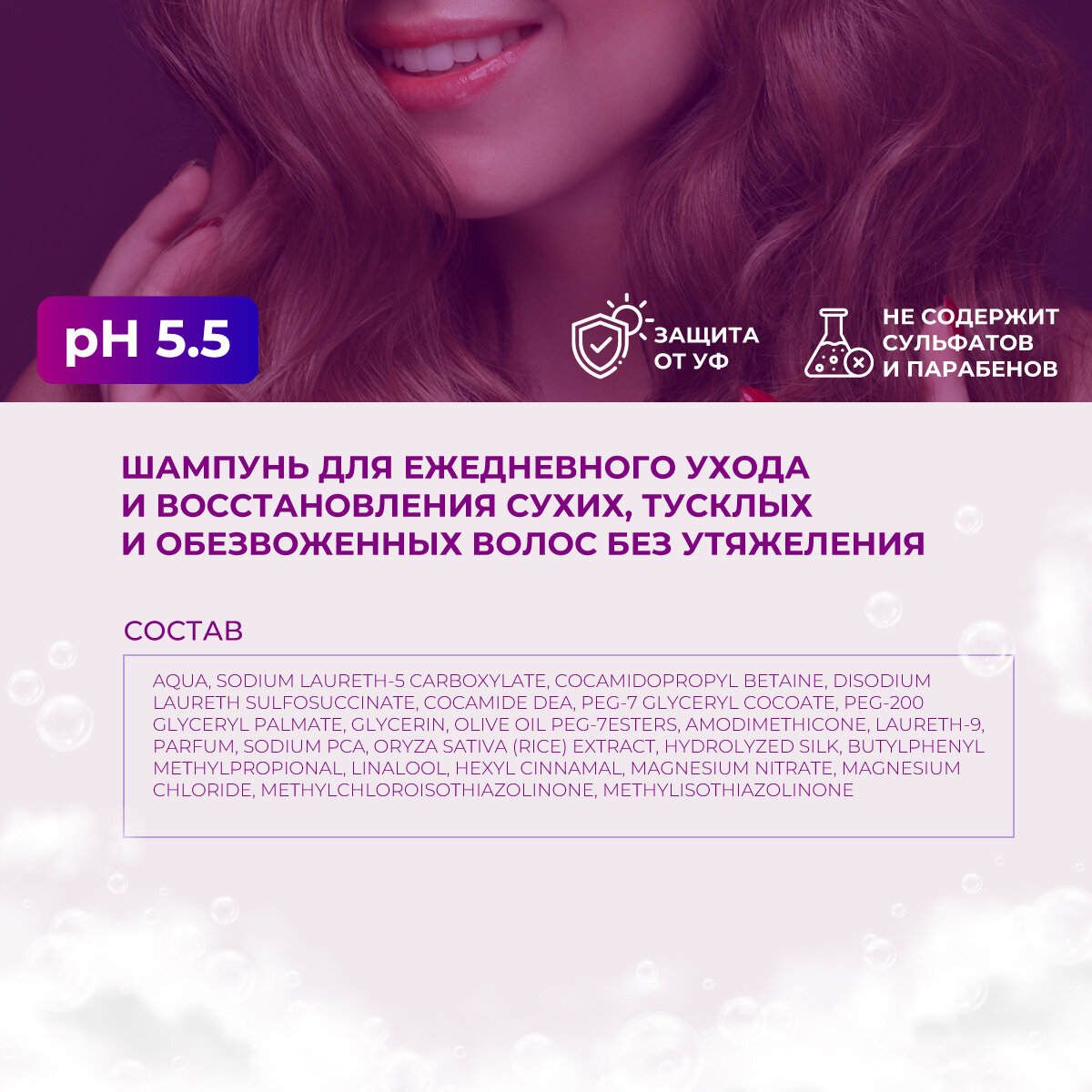 | Эффект | восстановление / глубокая очистка / защита от негативного воздействия окружающей среды / защита цвета / облегчение расчесывания / очищение / питание / придание блеска / придание мягкости / придание эластичности / против секущихся кончиков / разглаживание / себорегуляция / увлажнение / укрепление / уплотнение волос |