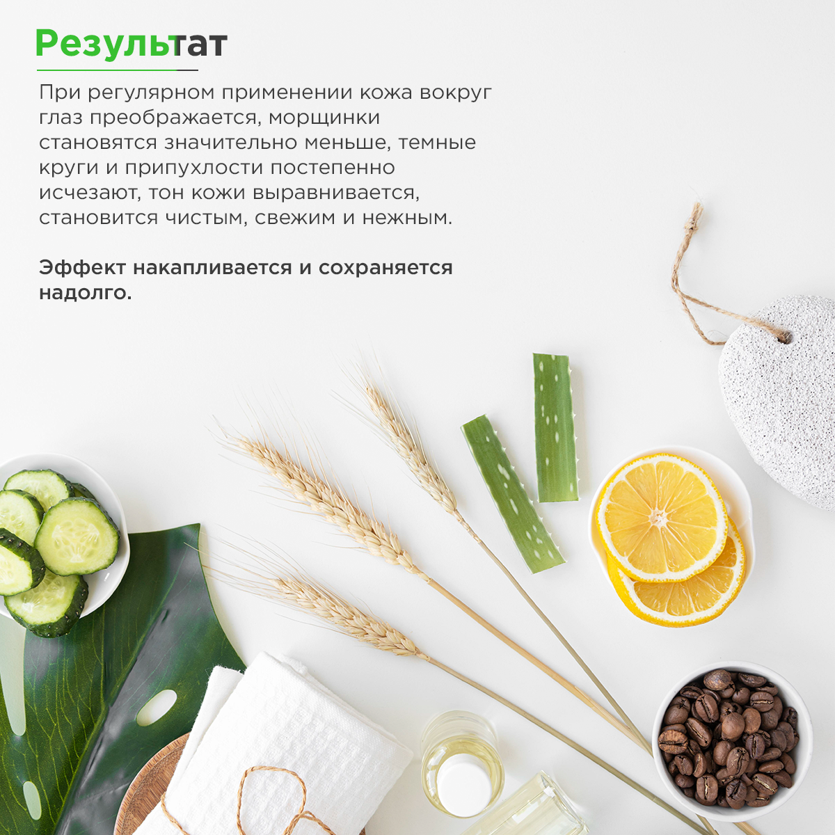 | Эффект | восстановление / лифтинг / омоложение / от кругов под глазами / от морщин / от отеков / отбеливание / очищение / питание / повышение упругости / снятие отеков / тонизирование / увлажнение / улучшение цвета |