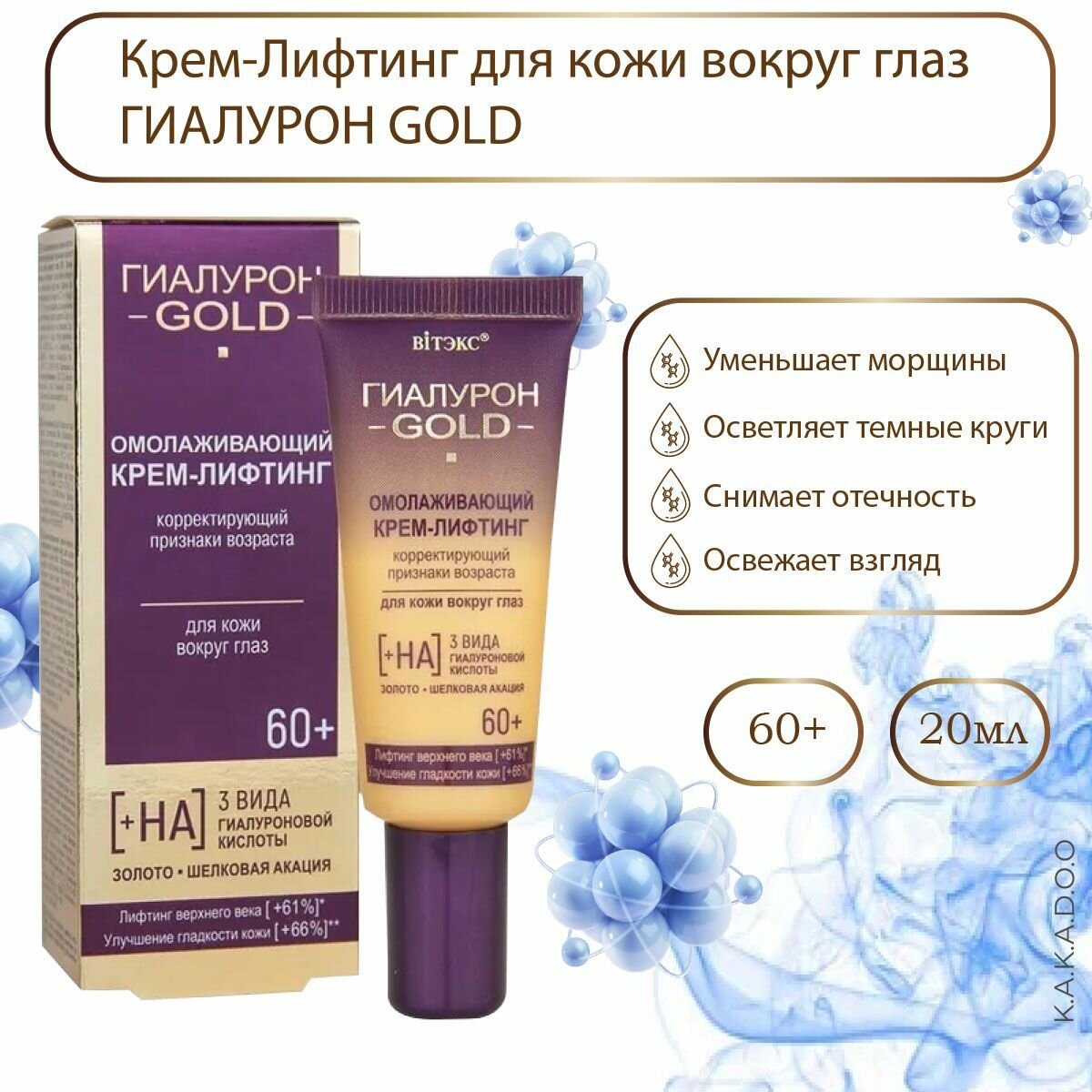 Омолаживающий крем-лифтинг для кожи вокруг глаз Витэкс гиалурон GOLD корректирующая 60+, 20 мл