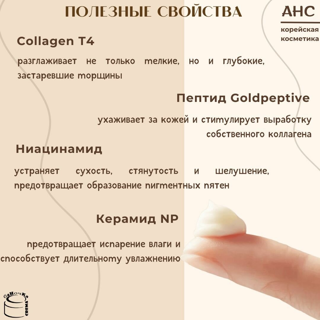 | Активный ингредиент | аденозин / аминокислоты / бета-глюкан / бифидобактерии / витамин A (ретинол) / витамин B3 (ниацинамид) / витамин C (аскорбиновая кислота) / витамин E / витамины / гиалуроновая кислота / глицерин / керамиды / коллаген / лактобактерии / пантенол (провитамин B5) / пептиды / пробиотики / сквалан / церамиды / эластин |