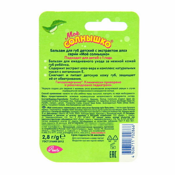| Состав набора | Бальзам для губ детский с алоэ вера Мое Солнышко 2,8 гр. |