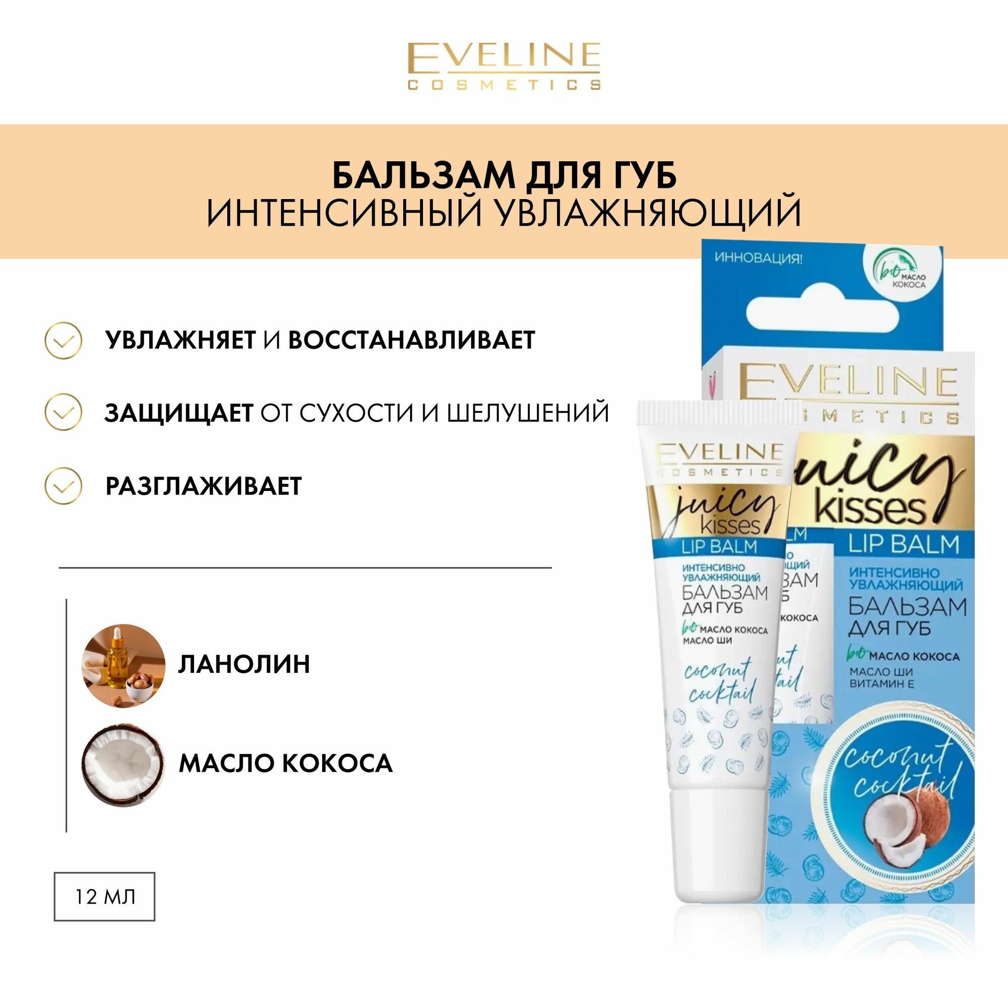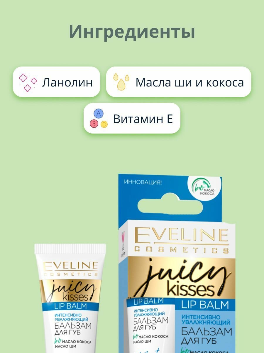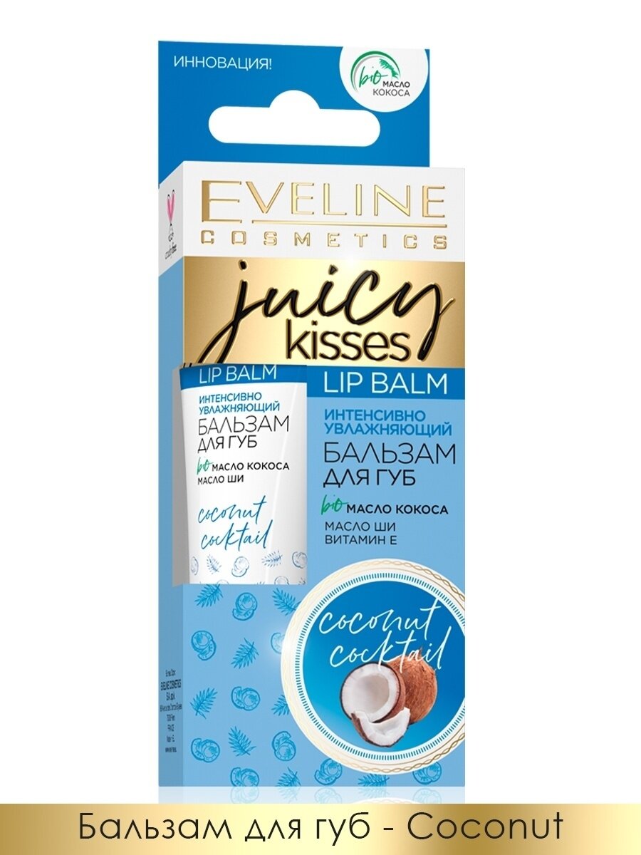 Бальзам-маска для губ EVELINE JUICY KISSES интенсивный увлажняющий аромат COCONUT COCKTAIL, 12мл