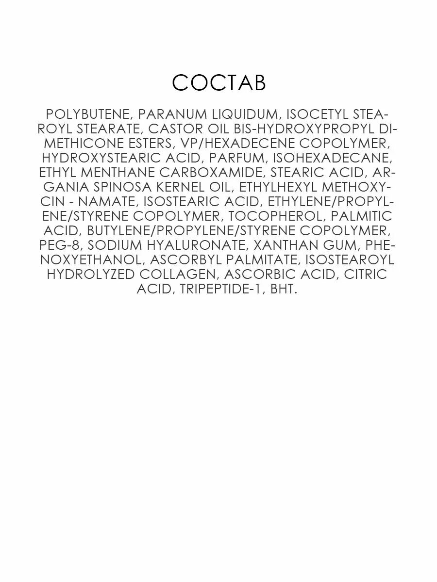 | Состав | polybutene, paranum liquidum, isocetyl stearoyl stearate, castor oil bis-hydroxypropyl dimethicone esters, vp/hexadecene copolymer, hydroxystearic acid, parfum, isohexadecane, ethyl menthane carboxamide, stearic acid, argania spinosa kernel oil, ethylhexyl methoxycin - namate, isostearic acid, ethylene/propylene/styrene copolymer, tocopherol, palmitic acid, butylene/propylene/styrene copolymer, peg-8, sodium hyaluronate, xanthan gum, phenoxyethanol, ascorbyl palmitate, isostearoyl hydrolyzed collagen, ascorbic acid, citric acid, tripeptide-1, bht |