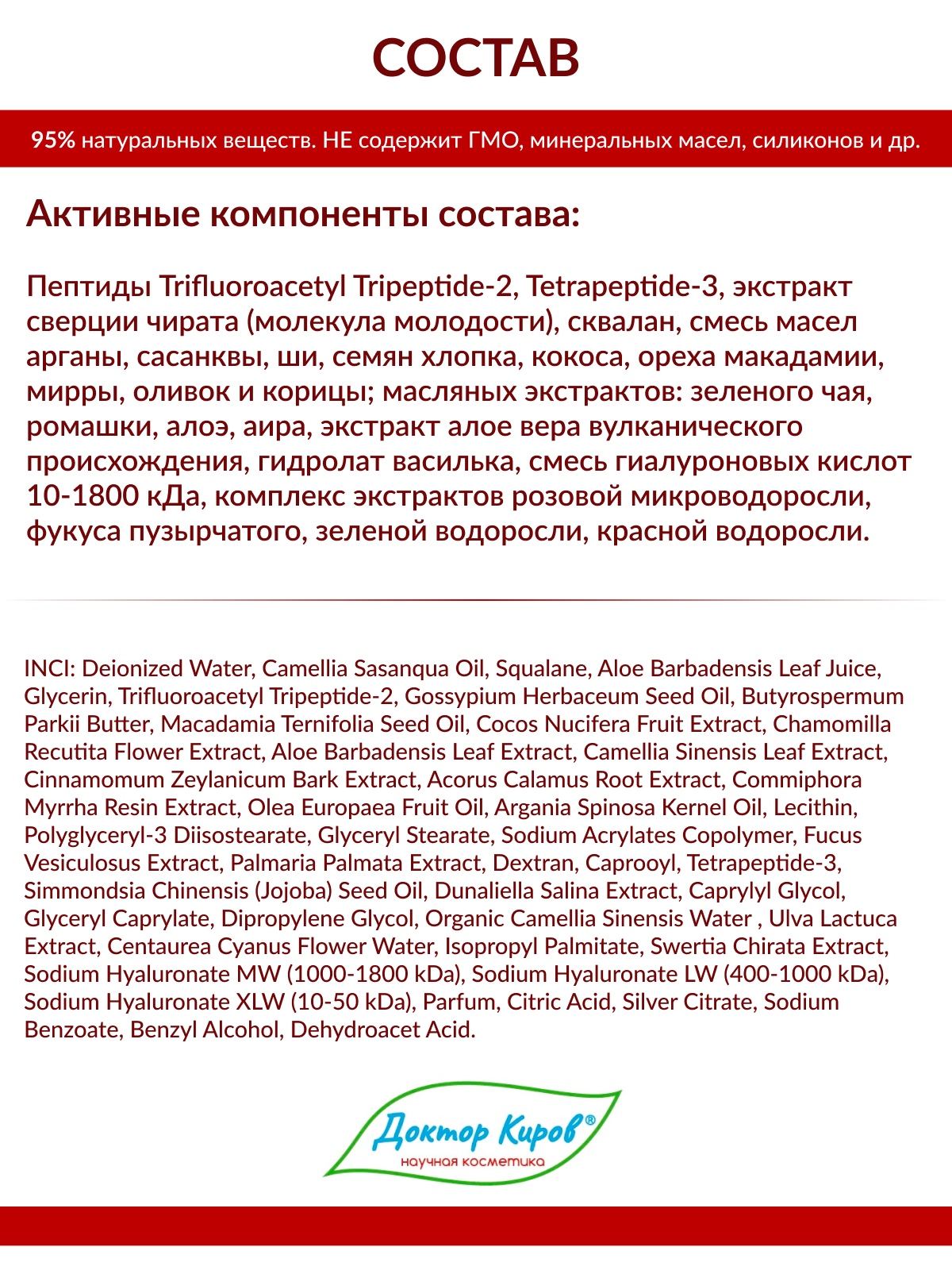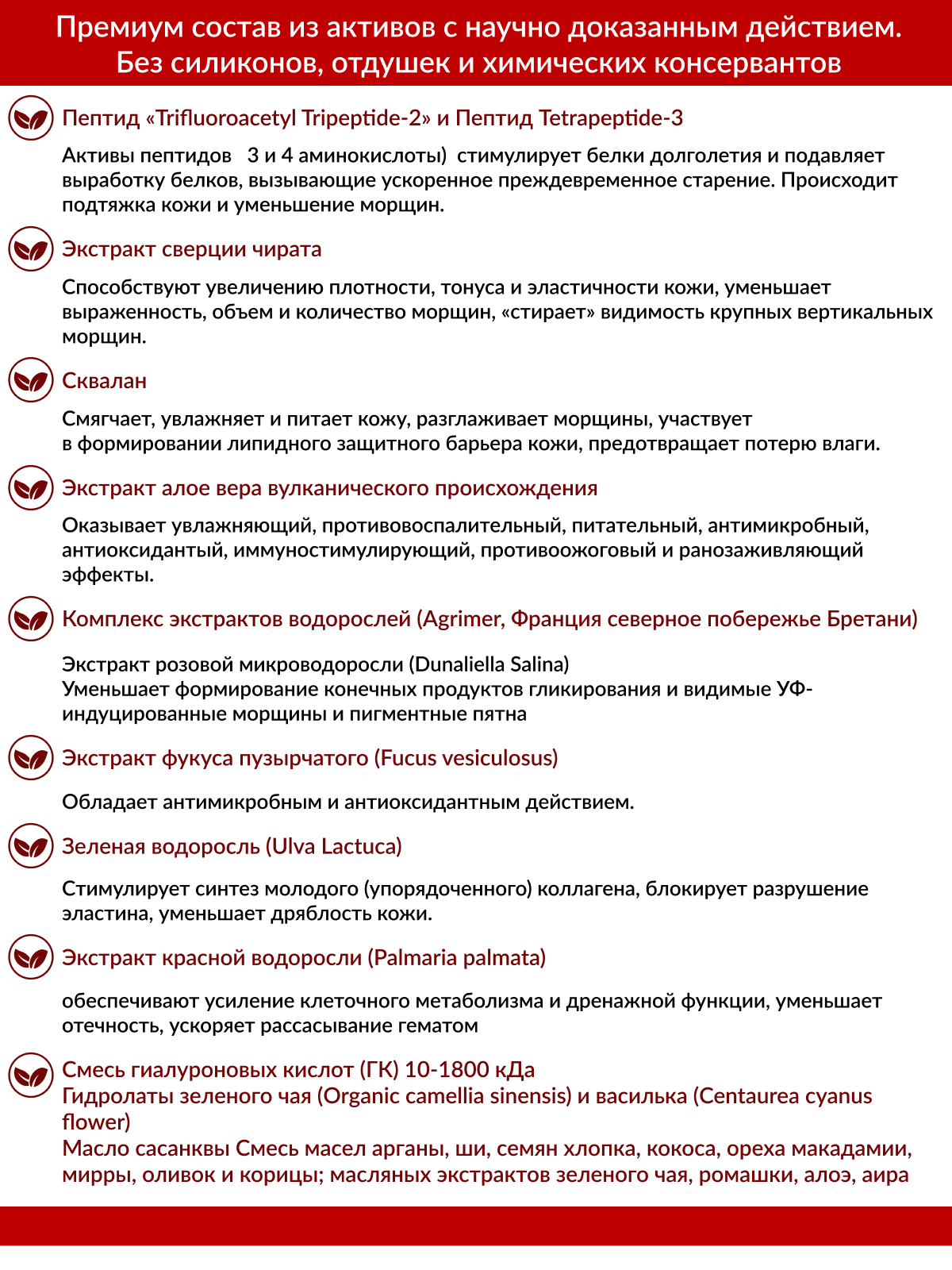| Состав | Пептид Trifluoroacetyl Tripeptide-2 , Пептид Tetrapeptide-3 , Экстракт сверции чирата , Сквалан, Масло сасанквы , Экстракт алое вера вулканического происхождения , Гидролаты зеленого чая и василька, Смесь гиалуроновых кислот (ГК) 10-1800 кДа, Комплекс экстрактов водорослей, Экстракт розовой микроводоросли, Экстракт фукуса пузырчатого, Зеленая водоросль, Экстракт красной водоросли, |