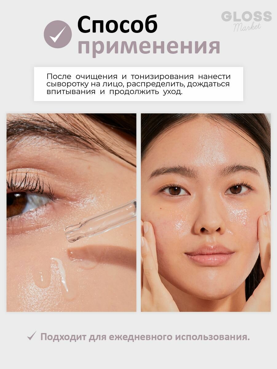 | Способ применения | нанесите 2-3 капли сыворотки на лицо, избегая области вокруг глаз и рта. Равномерно распределите массажными движениями до полного впитывания |
