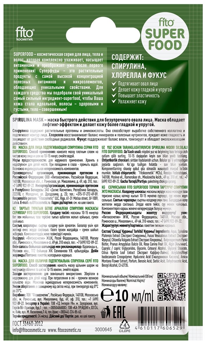 Fito косметик Спирулина, маска для лица подтягивающая, 12 г, 10 мл интересное: