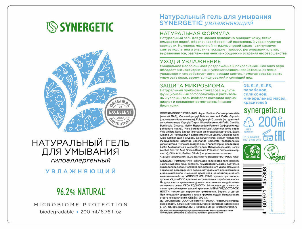 Synergetic, Гель для умывания увлажняющий 200 мл интересное: