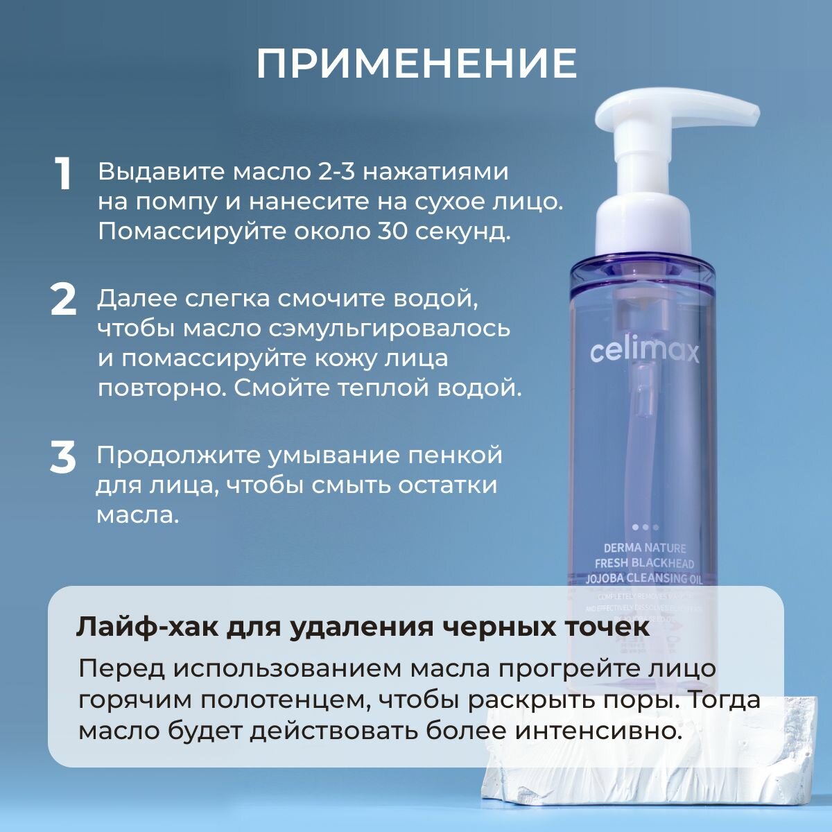 | Способ применения | Выдавите масло 3–5 нажатиями на помпу и сухими руками нанесите на лицо. Далее слегка смочите водой, чтобы масло сэмульгировалось и помассируйте кожу лица повторно. Смойте теплой водой. |