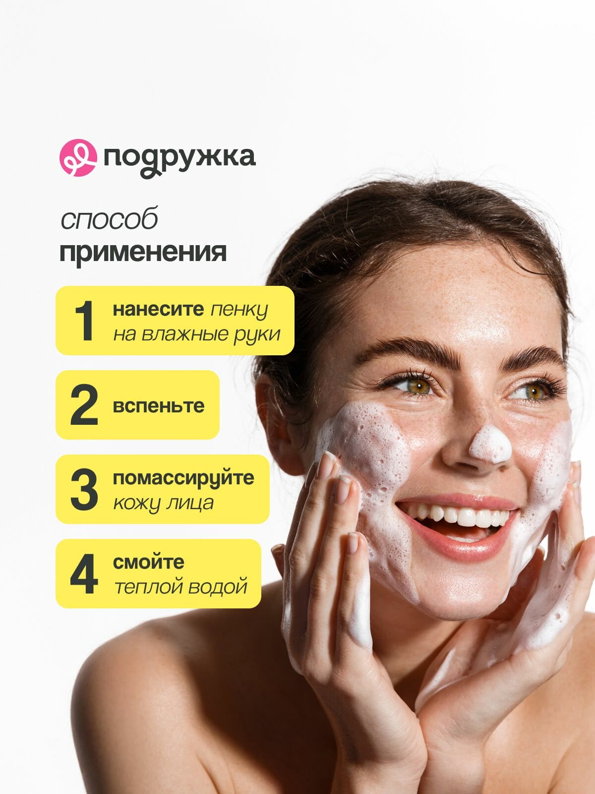 | Способ применения | вспенить средство с небольшим количеством воды и нанести на кожу лица массажными движениями, затем смыть теплой водой |