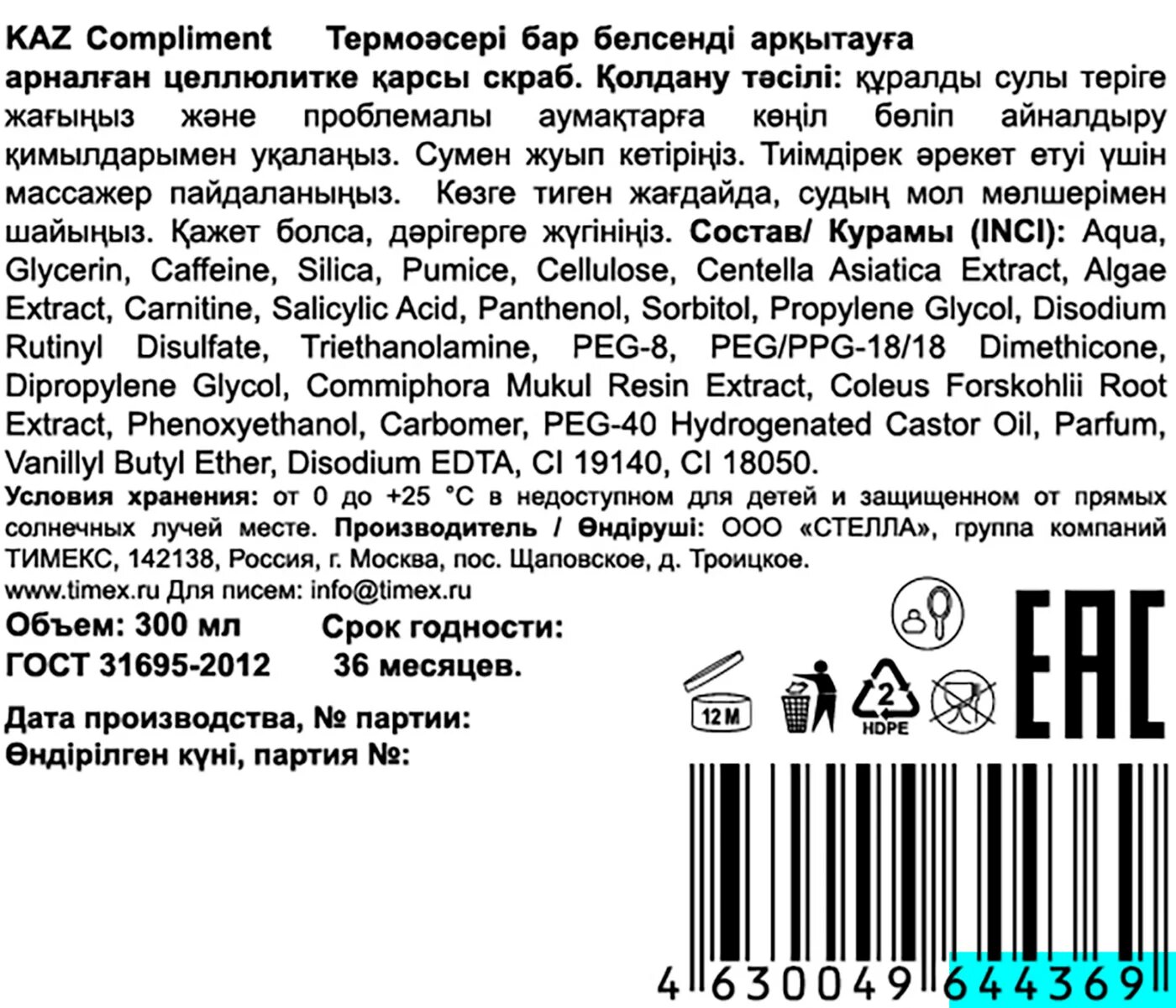 | Способ применения | нанесите массажными движениями на влажную кожу, уделяя особое внимание проблемным зонам тела (живот, бёдра). Смойте водой. Для более эффективного действия используйте массажёр. Средство обладает термоэффектом. Перед применением рекомендуется провести тест на чувствительность. При попадании в глаза, обильно промойте водой. При необходимости обратитесь к врачу. Противопоказания: индивидуальная непереносимость отдельных компонентов косметического средства. Не рекомендуется использовать на участках тела с повреждённой или раздражённой кожей. ВНИМАНИЕ! Не применять при варикозном расширении вен, слабых кровеносных сосудах и предрасположенности к образованию капиллярных сеток |