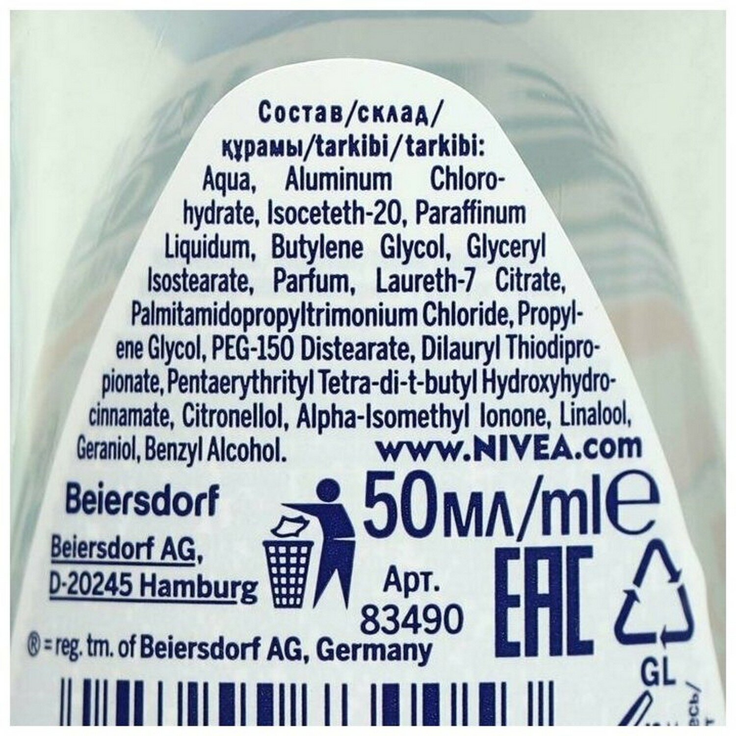 | Полный состав | Aqua, Aluminum Chlorohydrate, Isoceteth-20, Parafinum Liquidum, Butylene Glycol, Glyceryl Isostearate, Parfum, Laureth-7 Citrate, PalmitamidopropyltrimoniumChloride,Propylene Glycol, PEG-150 Distearate, Dilauryl Thiodipropionate, PentaerythritylTetra-di-t-butylHydroxyhydrocinnamate, Citronellol, Alpha-Isomethyl Ionone, Linalool, Geraniol, Benzyl Alcohol. |