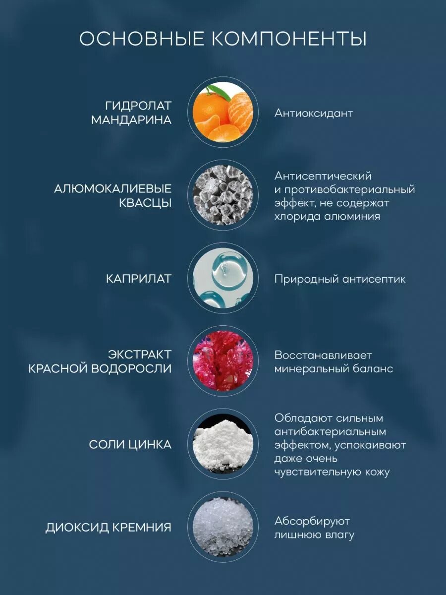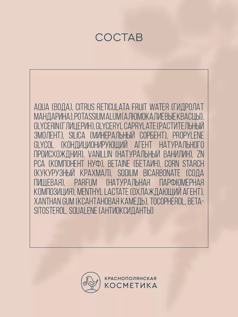 | Полный состав | Aqua (Вода), Lavandula Angustifolia Flower Water (Гидролат лаванды), Potassium Alum (Алюмокалиевые квасцы), Glycerin (Глицерин), Glyceryl Caprylate (Растительный эмолент), Silica (Минеральный сорбент), Propylene Glycol (Кондиционирующий агент натурального происхождния), Zn PCA (Компонент НУФ), Betaine (Бетаин), Lavandula Angustifolia Oil (Эфирное масло лаванды), Corn Starch (Кукурузный крахмал), Sodium Bicarbonate (Сода пищевая), Menthyl Lactate (Охлаждающий агент), Xanthan Gum (Ксантановая камедь), Tocopherol (and) Beta-Sitosterol (and) Squalene (Антиоксиданты). |