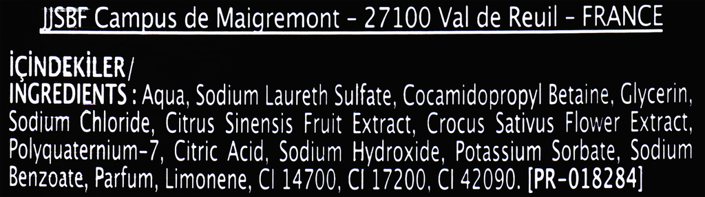 | Состав | Aqua, Sodium Laureth Sulfate, Cocamidopropyl Betaine, Glycerin, Sodium Chloride, Cupressus Sempervirens Leaf/Stem Extract, Zingiber Officinale Root Extract, Polyquaternium-7, Citric Acid, Sodium Hydroxide, Sodium Benzoate, Parfum, CI 47005, CI 15985. |