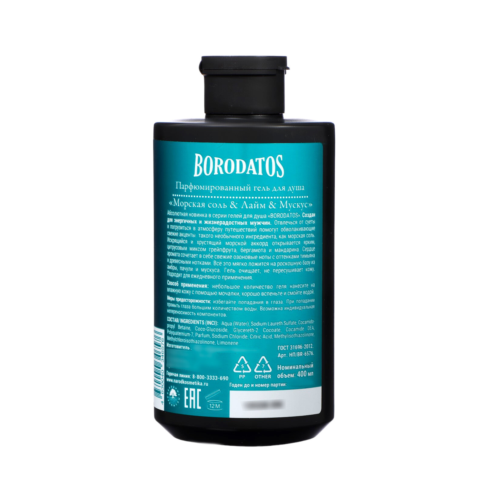 Бородатос Borodatos Парфюмированный большой гель для душа "Морская соль, Лайм, Мускус", 400 мл